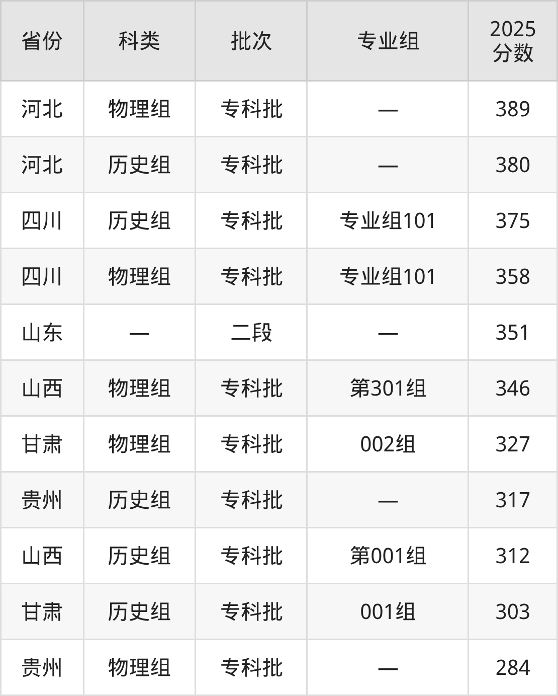 而河北地区物理组考生的分数门槛最高,2025年神木职业技术学院在河北招生最低分为389分,考生至少要超专科线189分才有可能被录取。