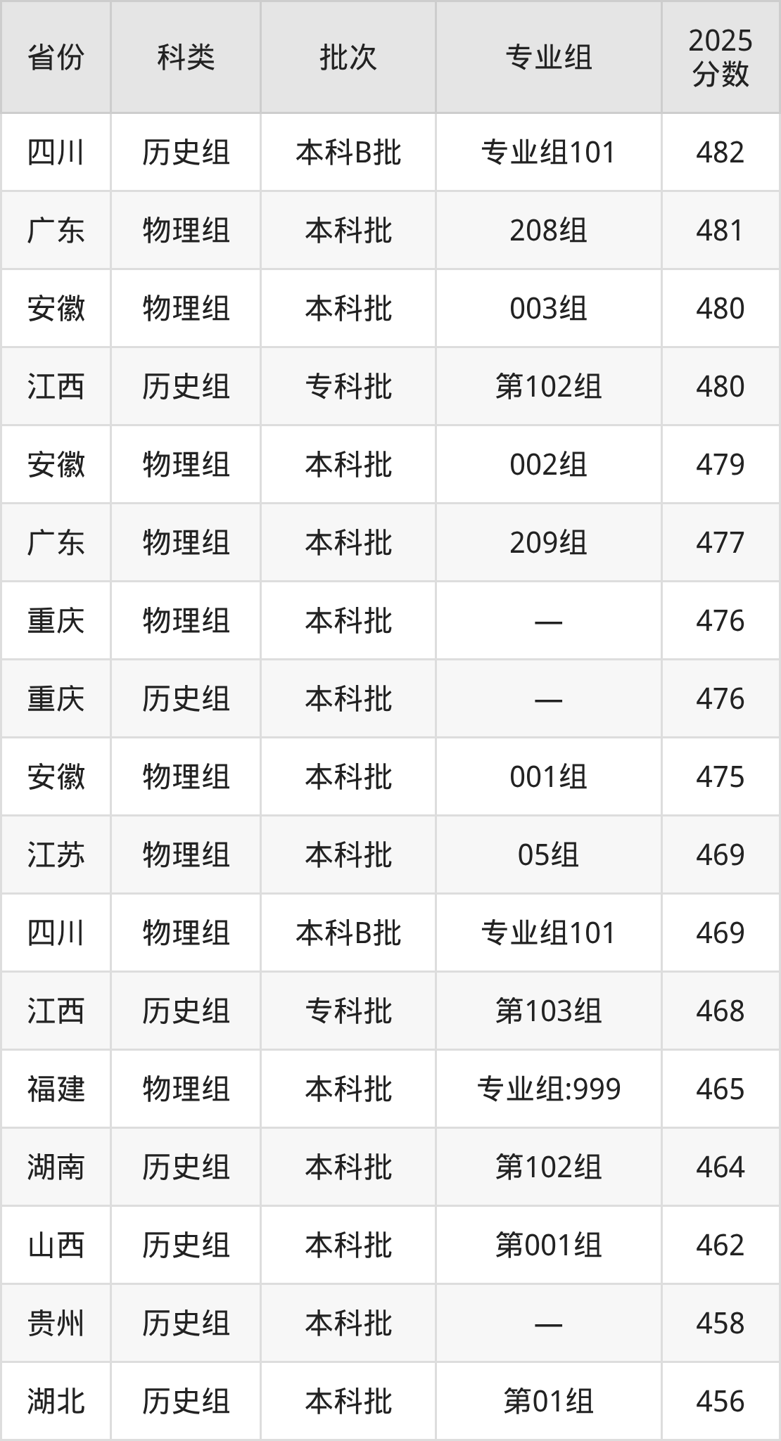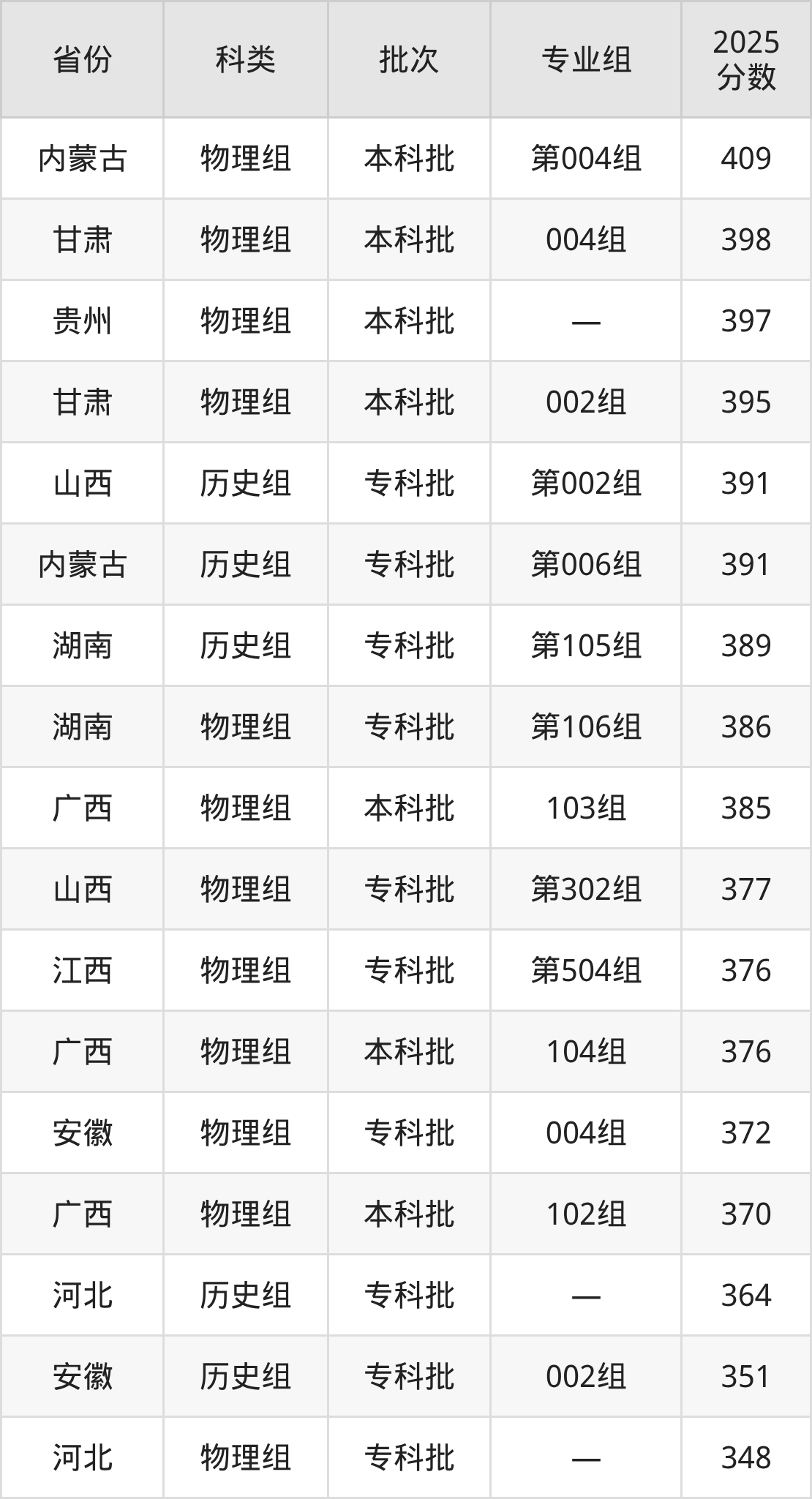 2025年武汉纺织大学外经贸学院在全国普通批次招生的录取分数范围位于220~547分之间,其中省内分数范围为282分~456分,历史组最低分专业组为“第05组”,考生298分即可报考,物理组最低分专业组为“第06组”,考生282分即可报考。