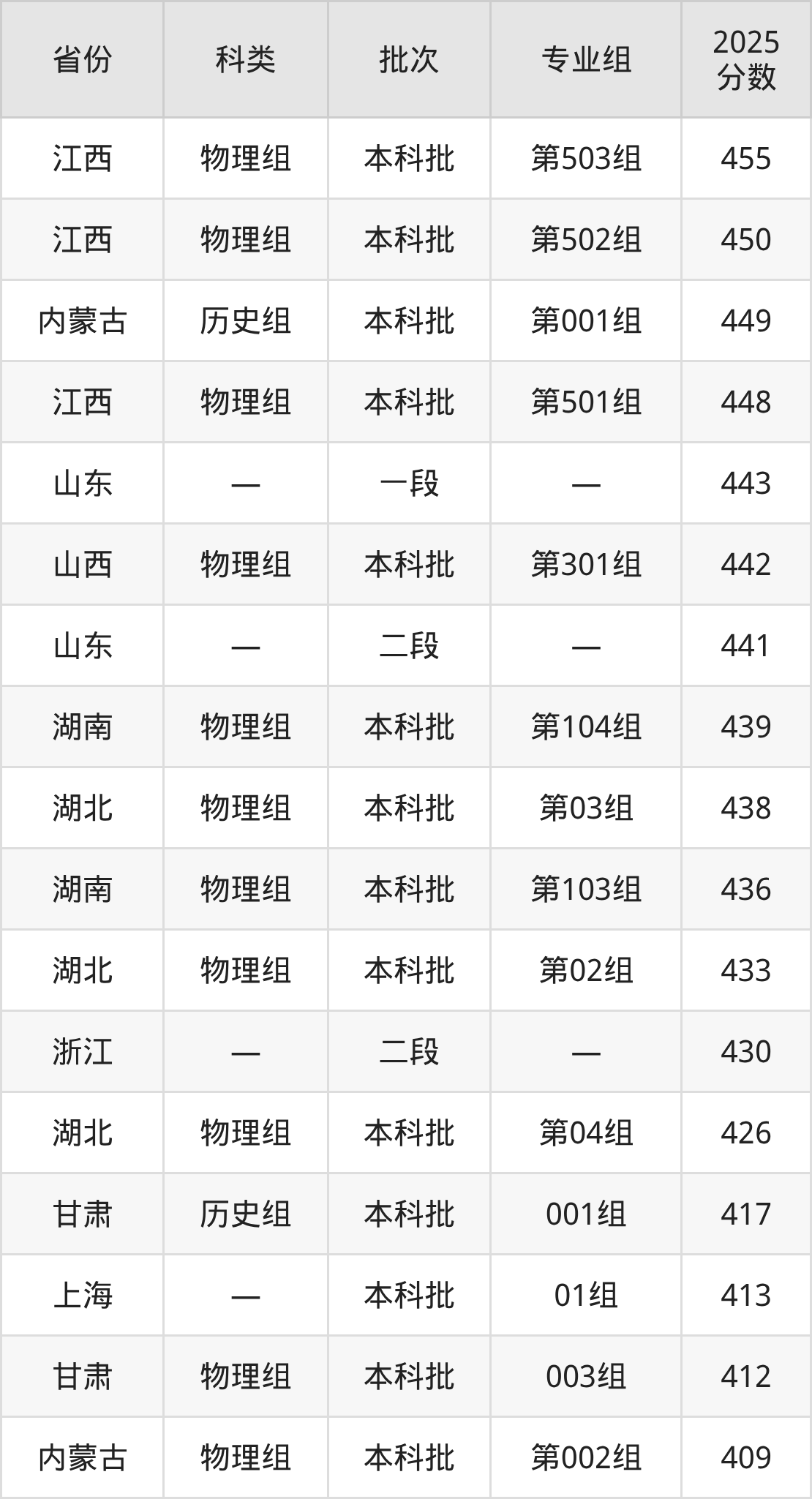 下面是武汉纺织大学外经贸学院2025年在全国各省的录取分数线一览表,供参考: