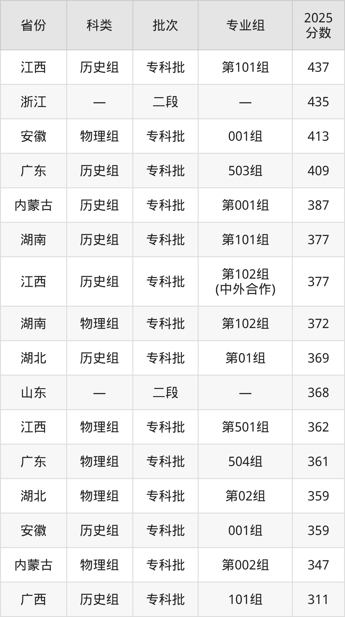 2025年江西旅游商贸职业学院在全国普通批次招生的录取分数范围位于270~437分之间,其中省内分数范围为270分~437分,历史组最低分专业组为“第102组(中外合作)”,考生377分即可报考,物理组最低分专业组为“第502组(中外合作)”,考生270分即可报考。