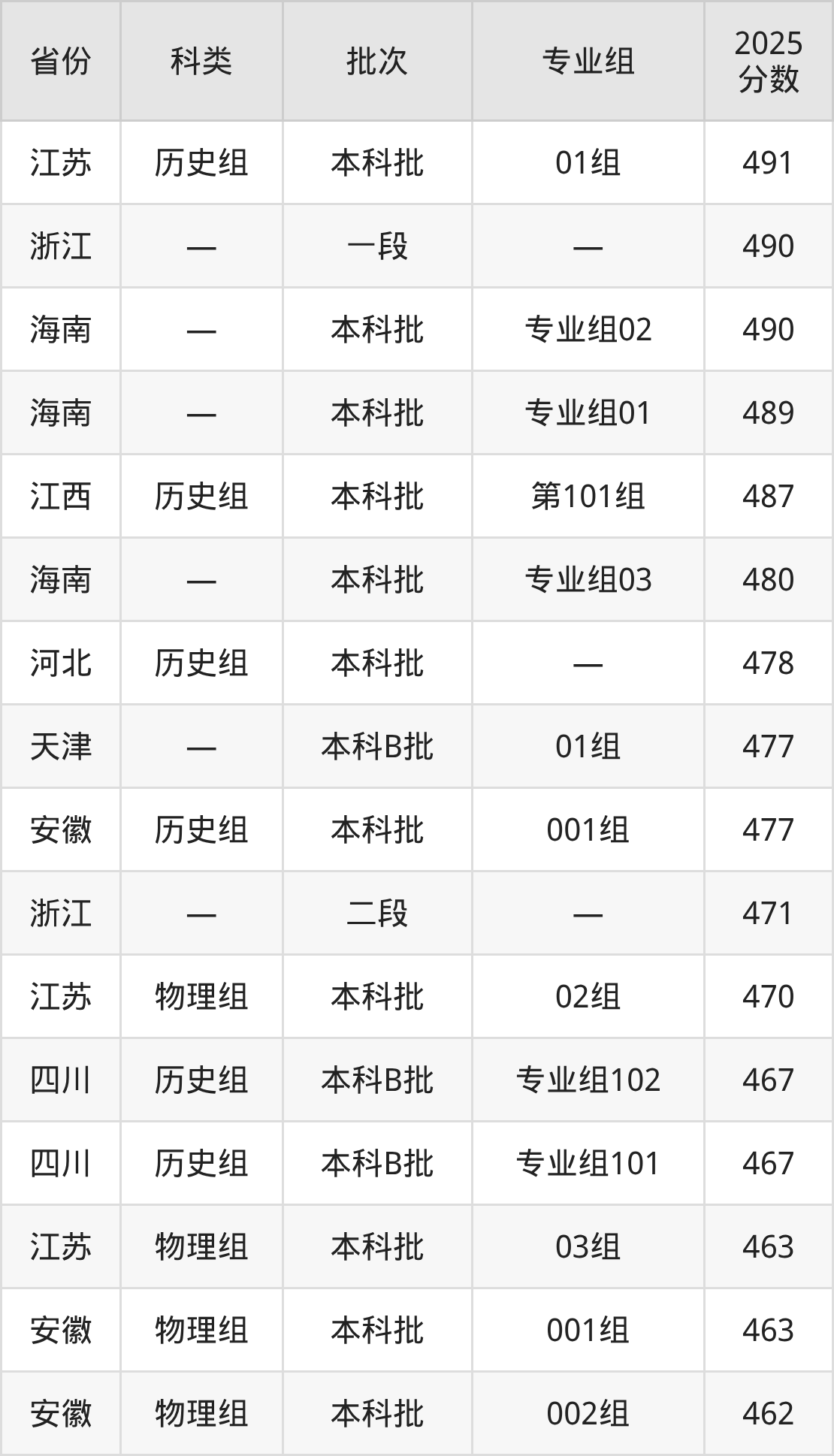 而江苏地区历史组考生的分数门槛最高,2025年长春工业大学人文信息学院01组在江苏招生最低分为491分,考生至少要超本科线9分才有可能被录取。