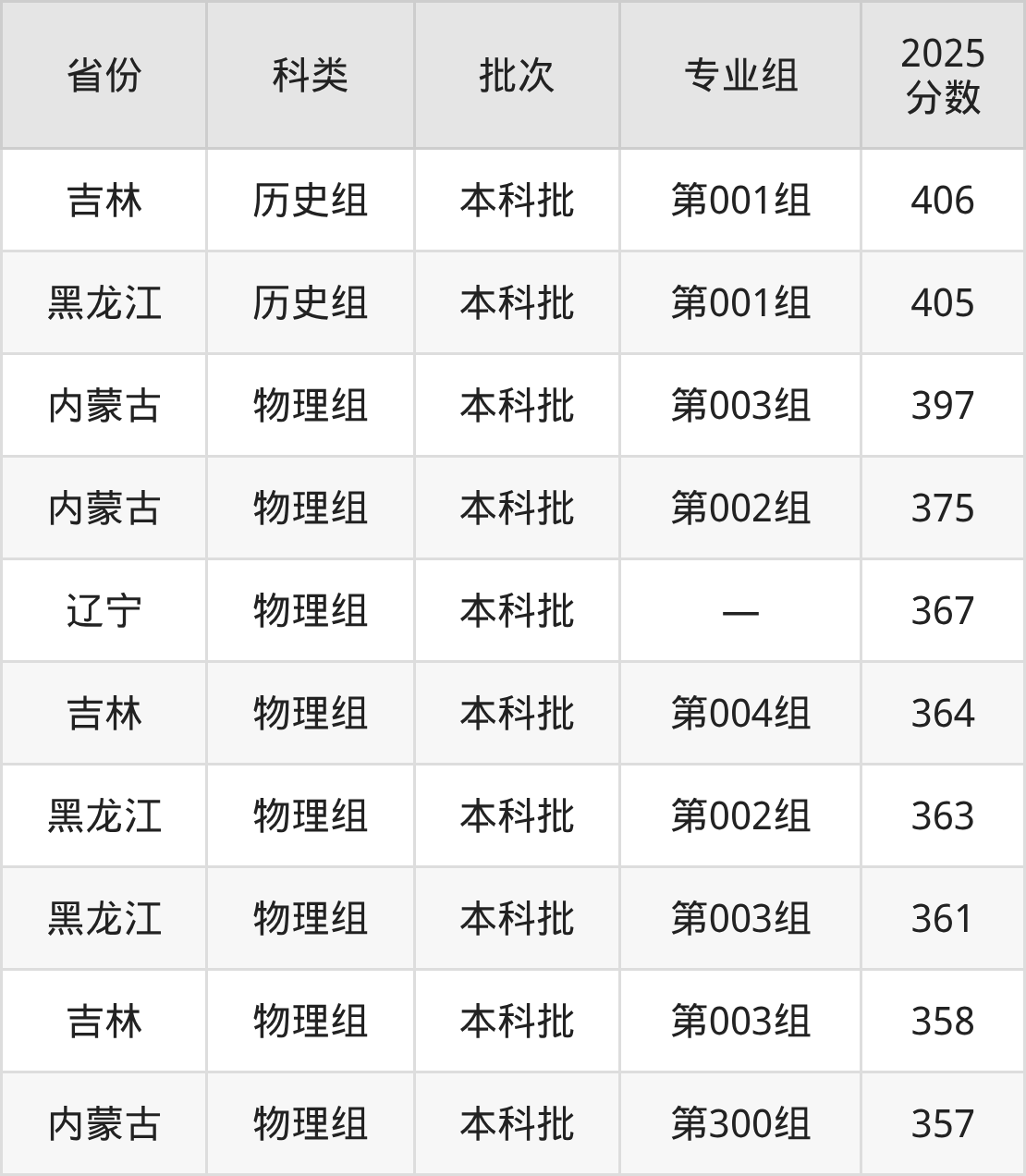 2025年长春工业大学人文信息学院在全国普通批次招生的录取分数范围位于357~491分之间,其中省内分数范围为358分~406分,历史组最低分专业组为“第001组”,考生406分即可报考,物理组最低分专业组为“第003组”,考生358分即可报考。