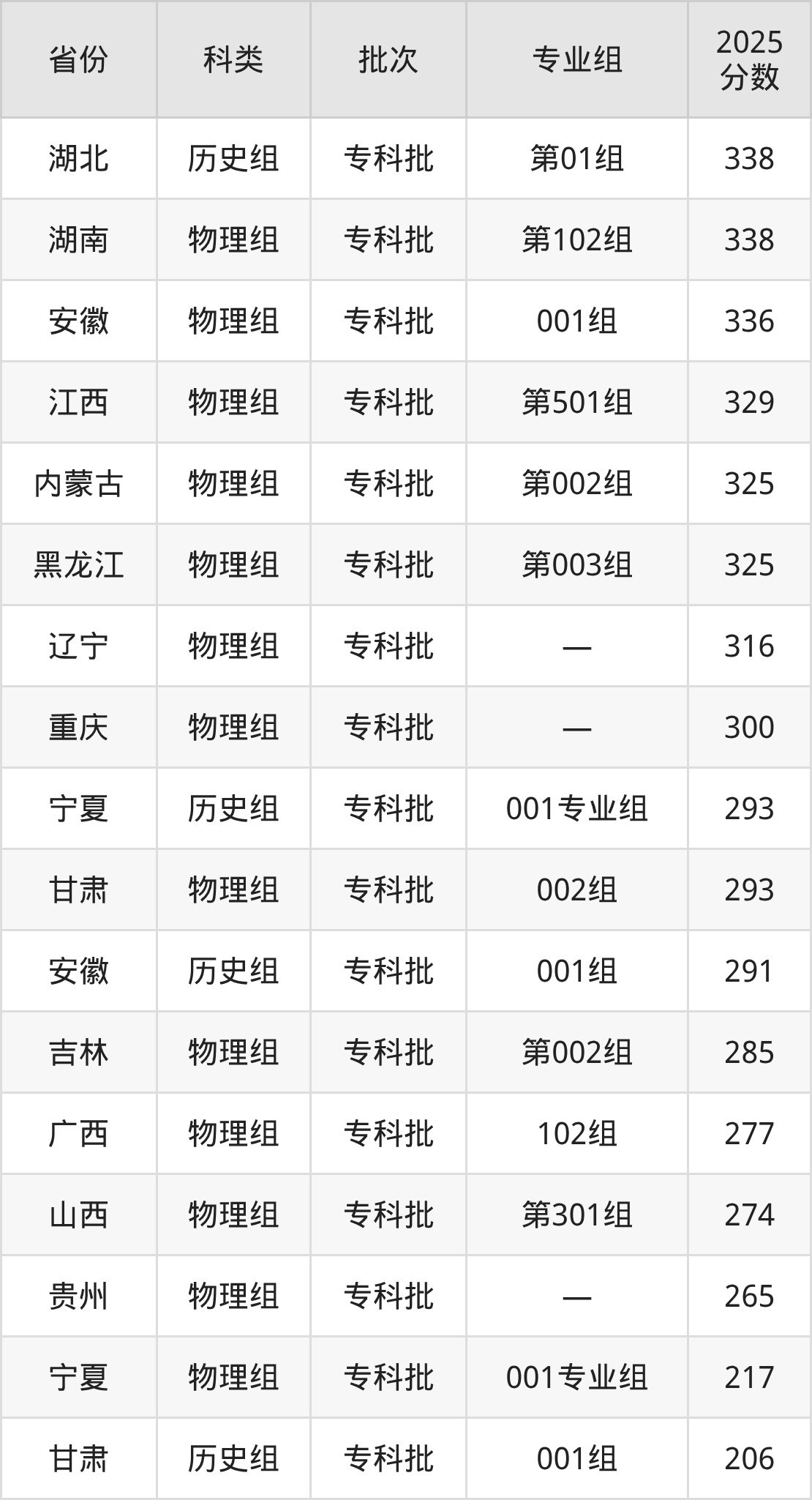黑龙江建筑职业技术学院在省外招生的最低分为150分,其中四川地区物理组考生上黑龙江建筑职业技术学院的分数门槛最低,考生成绩达专科线即可报考。其次是广西历史组考生,上黑龙江建筑职业技术学院至少要超专科线3分(203分)。