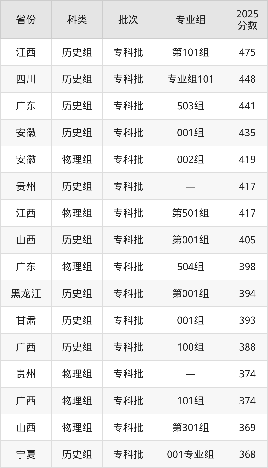 而江西地区历史组考生的分数门槛最高,2025年安庆医药高等专科学校第101组在江西招生最低分为475分,考生至少要超专科线185分才有可能被录取。