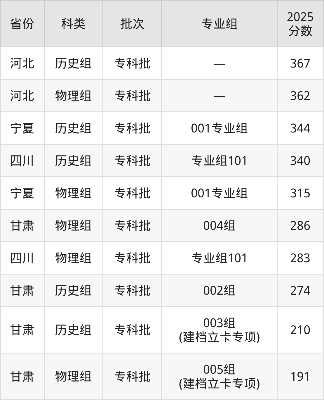 而河北地区历史组考生的分数门槛最高,2025年甘肃钢铁职业技术学院在河北招生最低分为367分,考生至少要超专科线167分才有可能被录取。