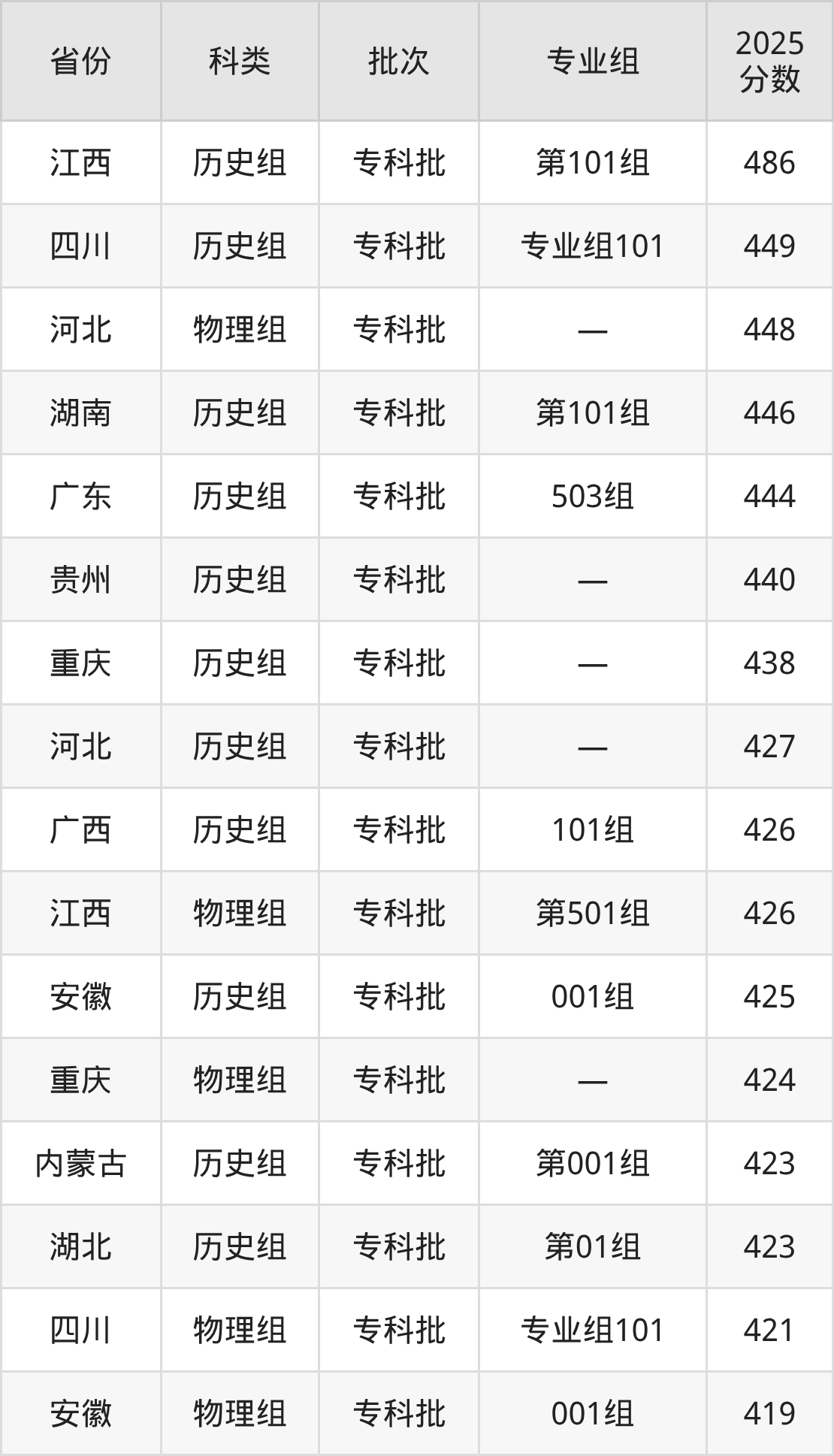 而江西地区历史组考生的分数门槛最高,2025年漳州职业技术学院第101组在江西招生最低分为486分,考生至少要超专科线196分才有可能被录取。