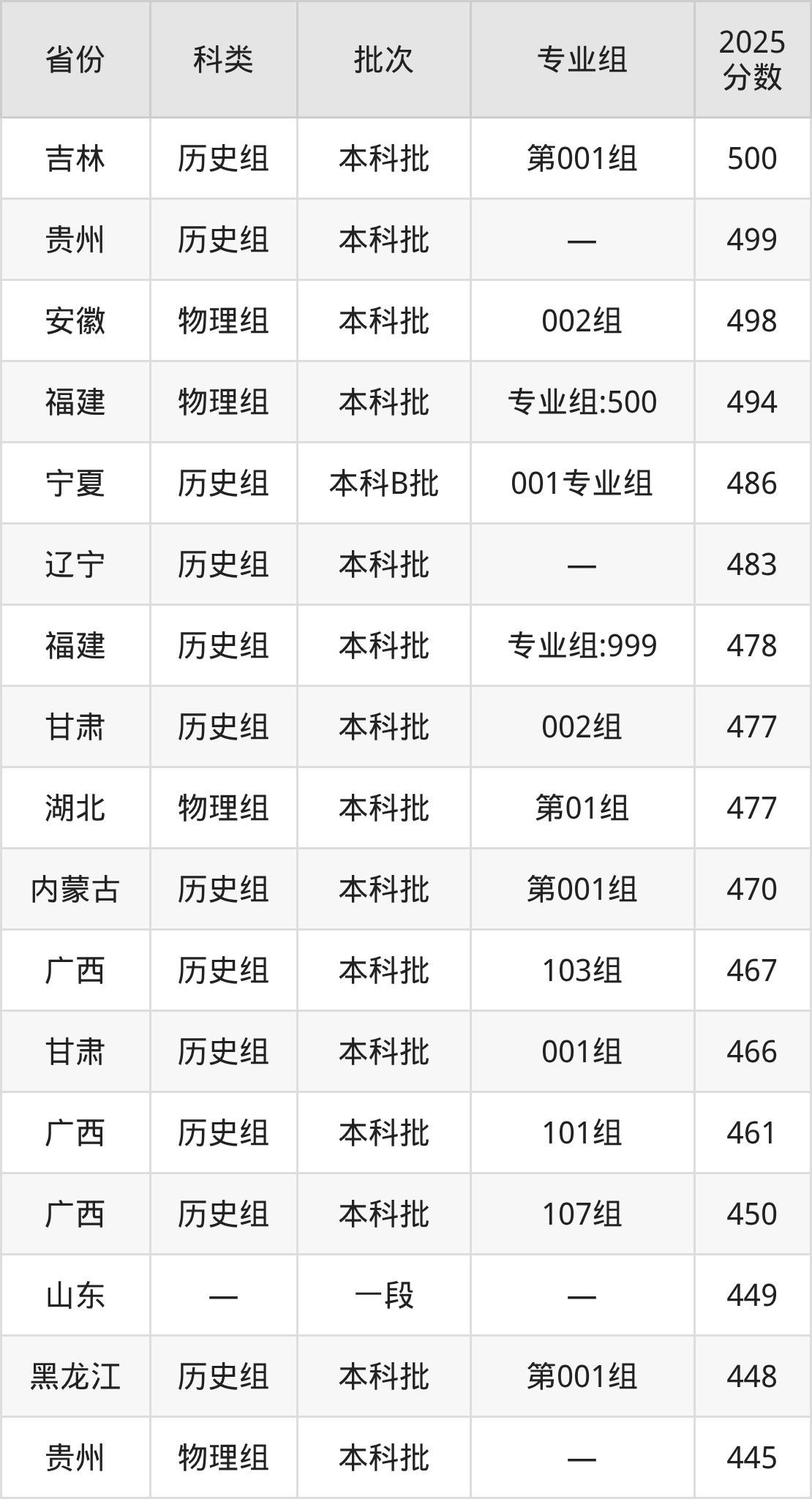 德州学院在省内招生最低录取分数线为401分,在省外招生最低录取分数线为407分,不同地区、不同科类的考生最低分有差异。