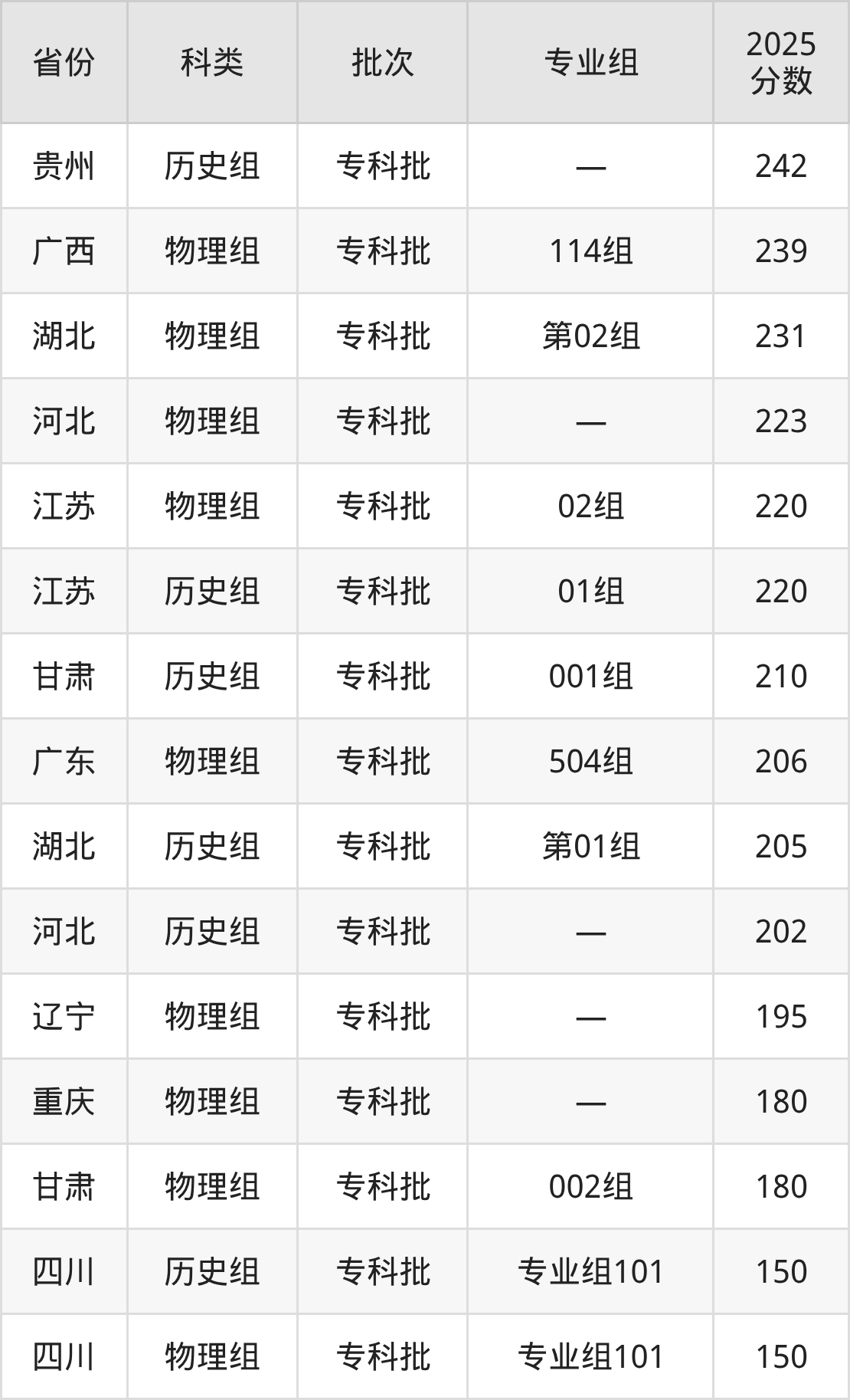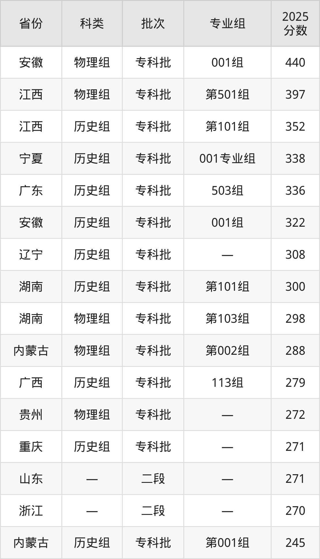 而安徽地区物理组考生的分数门槛最高,2025年四川文化传媒职业学院001组在安徽招生最低分为440分,考生至少要超专科线240分才有可能被录取。