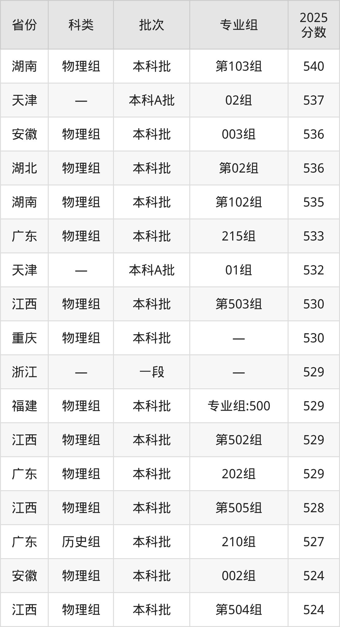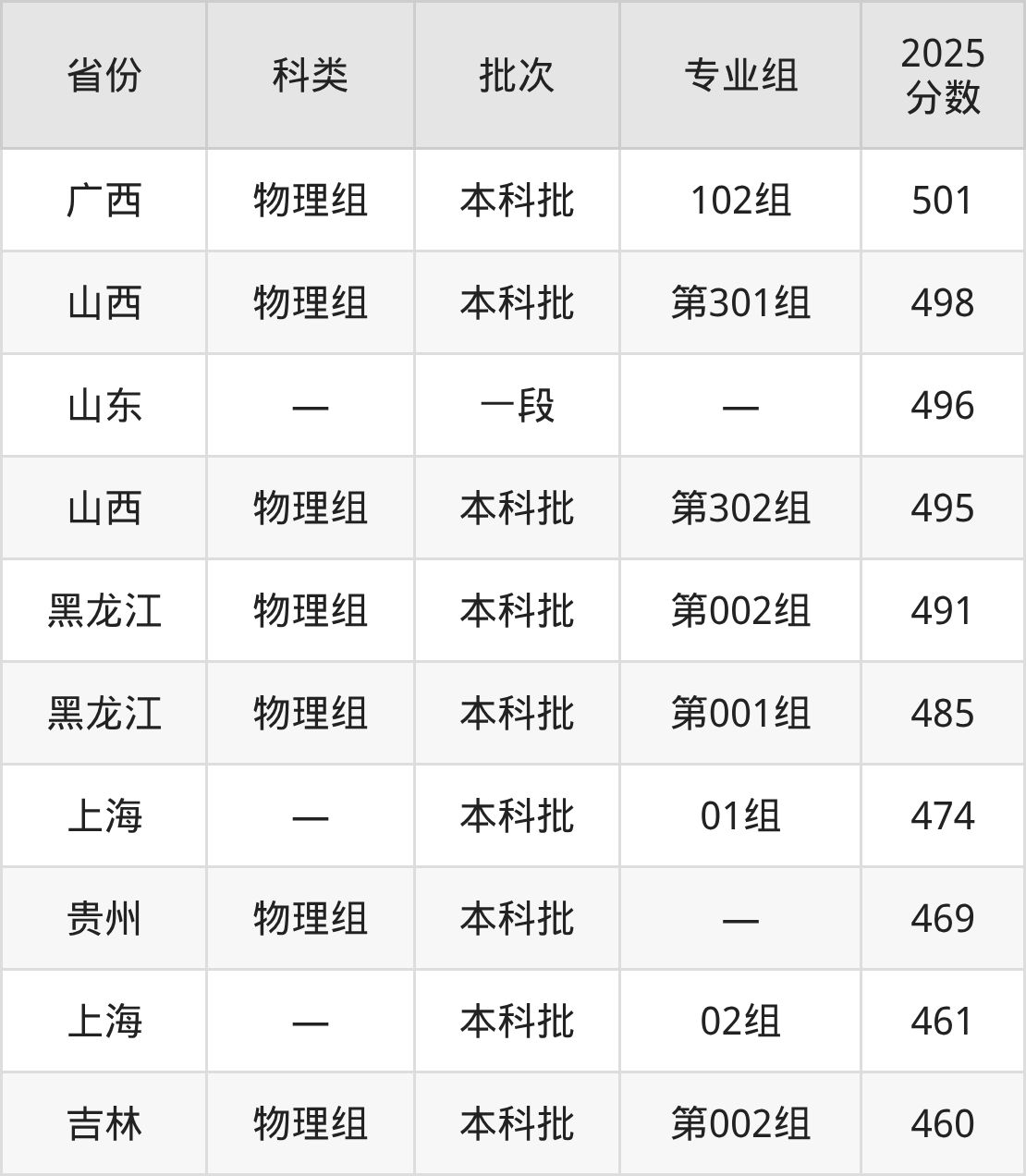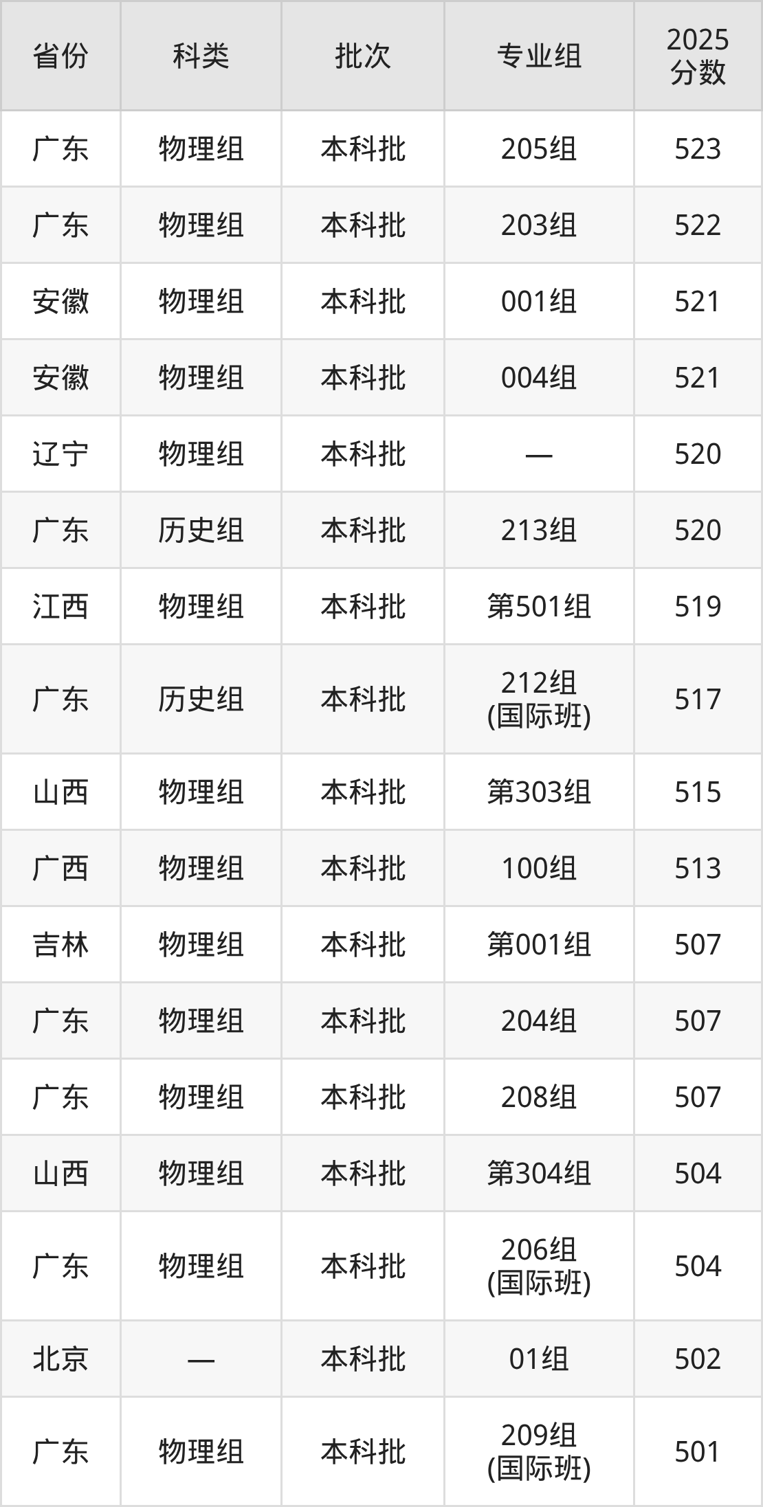 2025年广东药科大学在全国普通批次招生的录取分数范围位于460~628分之间,其中省内分数范围为501分~568分,历史组最低分专业组为“212组(国际班)”,考生517分即可报考,物理组最低分专业组为“209组(国际班)”,考生501分即可报考。