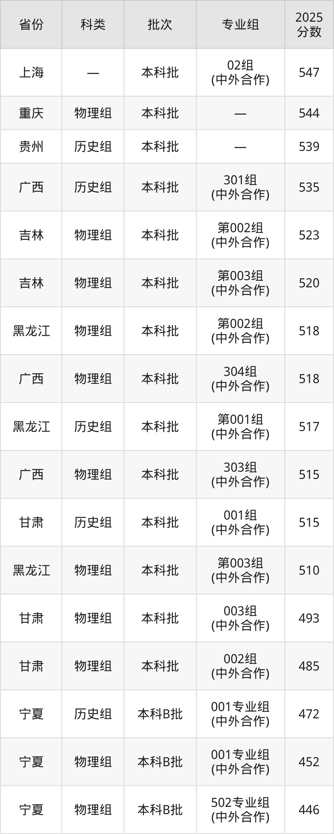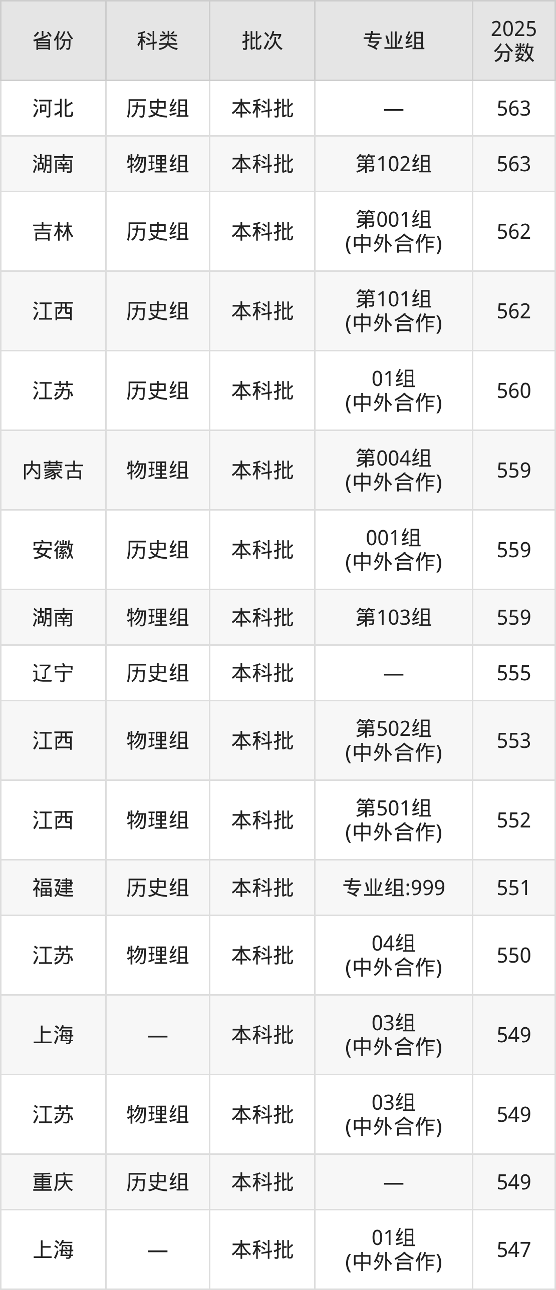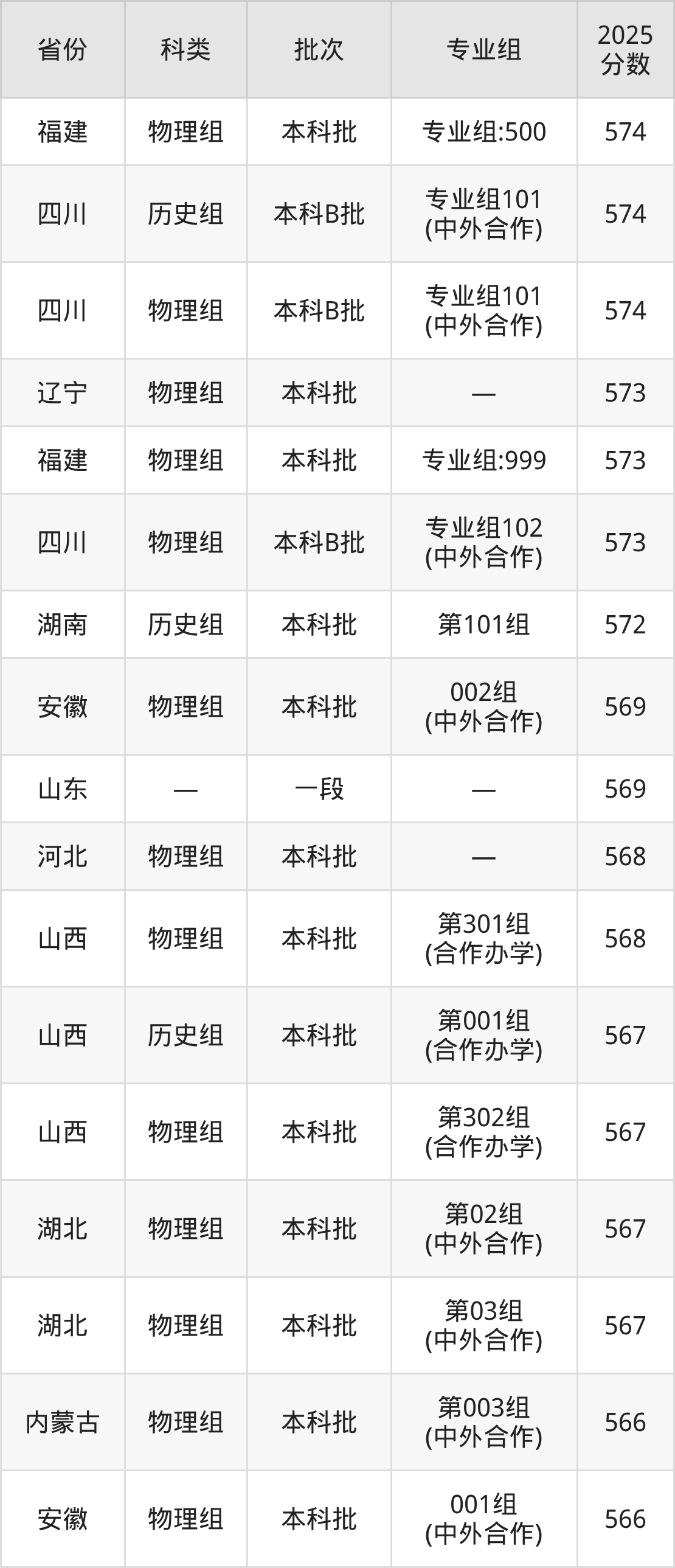 西交利物浦大学2026年录取分数需在高招结束官方数据公布后更新,2026届有意向报考该校的同学,可以在填报志愿时参考西交利物浦大学2025年录取分数线: