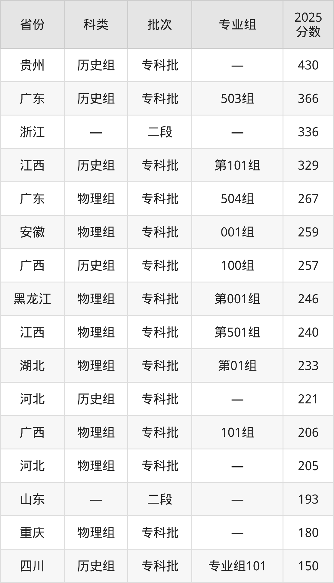 而贵州地区历史组考生的分数门槛最高,2025年漳州科技职业学院在贵州招生最低分为430分,考生至少要超专科线250分才有可能被录取。