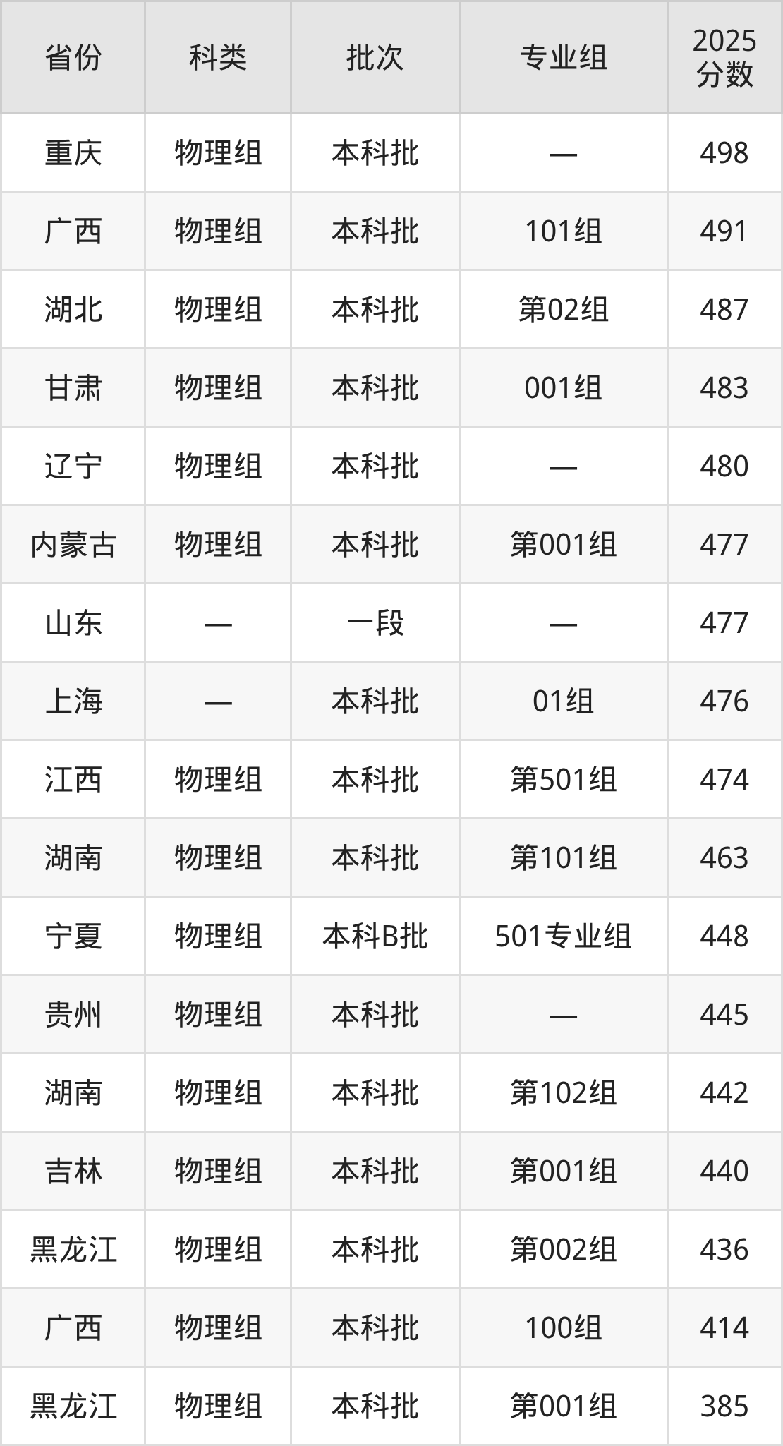 济宁医学院在省外招生的最低分为385分,其中黑龙江地区物理组考生上济宁医学院的分数门槛最低,考生成绩超本科线25分(385分)可上。其次是广西物理组考生,上济宁医学院至少要超本科线44分(414分)。