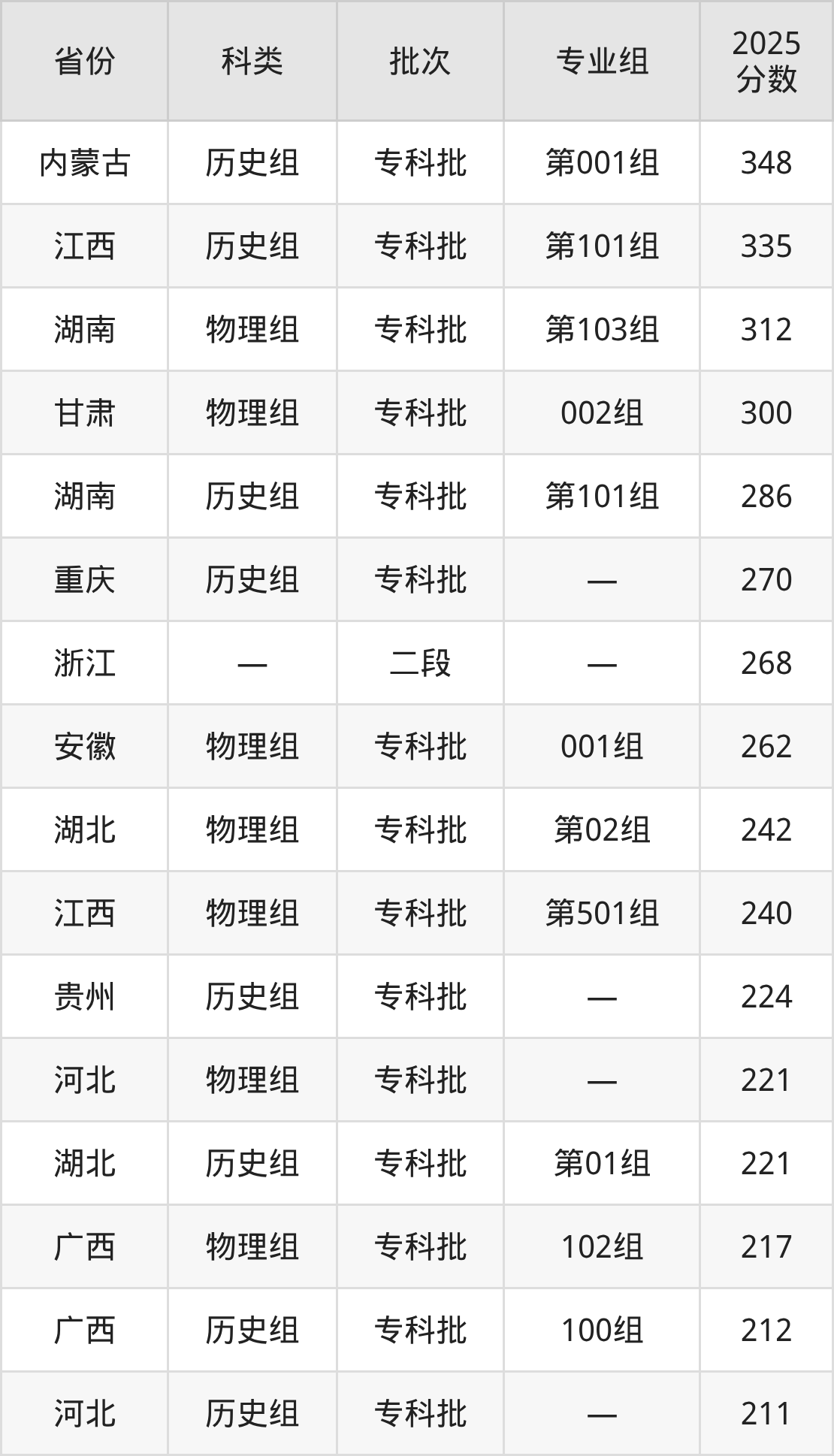 而内蒙古地区历史组考生的分数门槛最高,2025年贵州工贸职业学院第001组在内蒙古招生最低分为348分,考生至少要超专科线188分才有可能被录取。