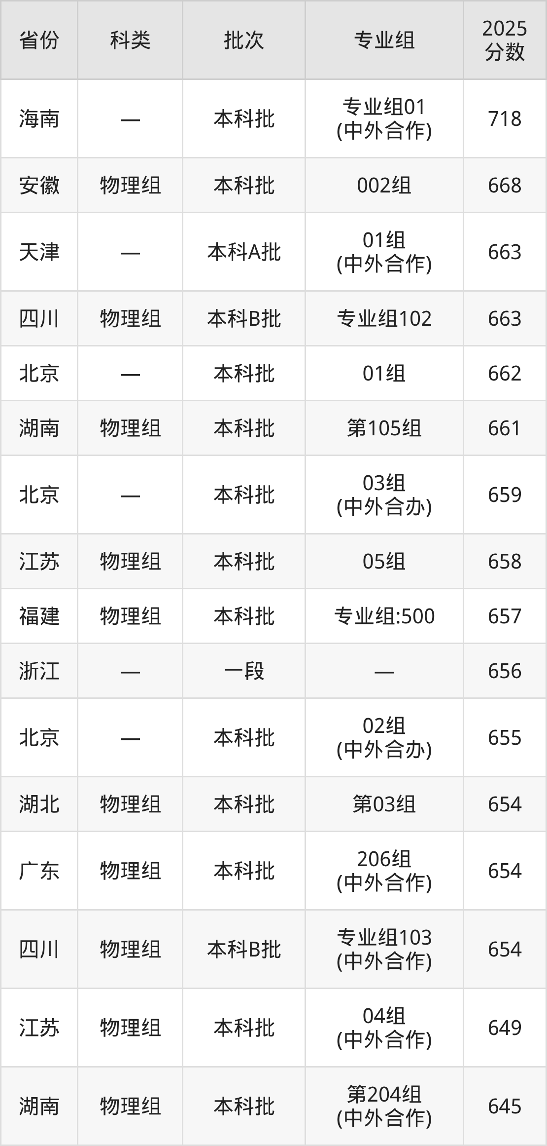 而海南地区考生的分数门槛最高,2025年中国人民大学(苏州校区)专业组01(中外合作)在海南招生最低分为718分,考生至少要超本科线238分才有可能被录取。