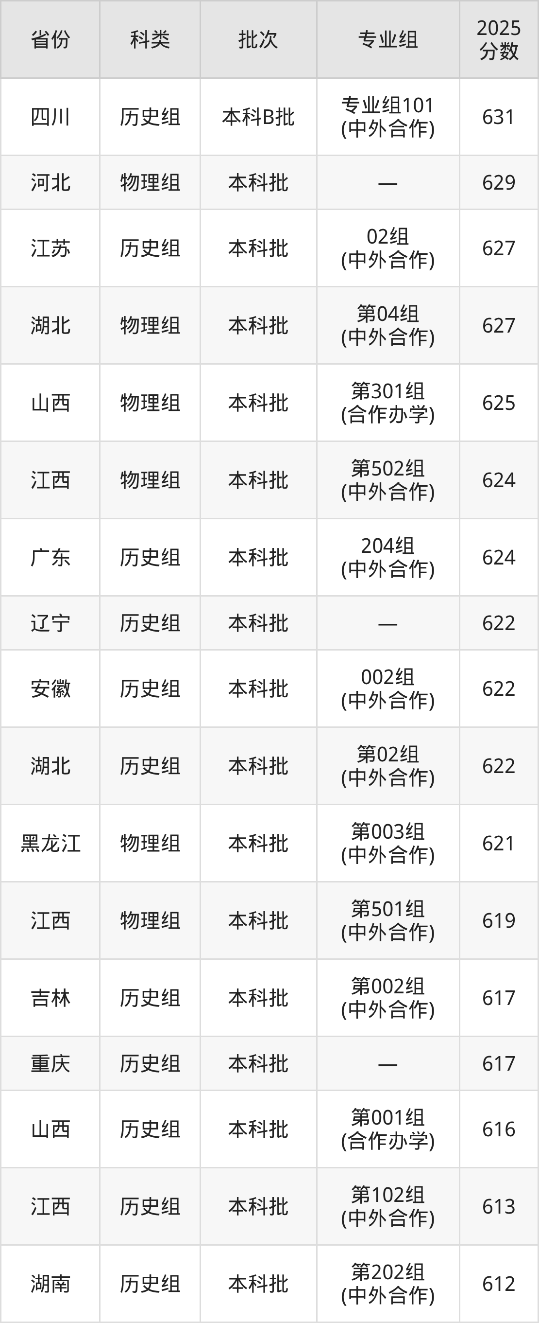 2025年中国人民大学(苏州校区)在全国普通批次招生的录取分数范围位于580~718分之间,其中省内分数范围为627分~658分,物理组最低分专业组为“03组(中外合作)”,考生643分即可报考,历史组最低分专业组为“02组(中外合作)”,考生627分即可报考。