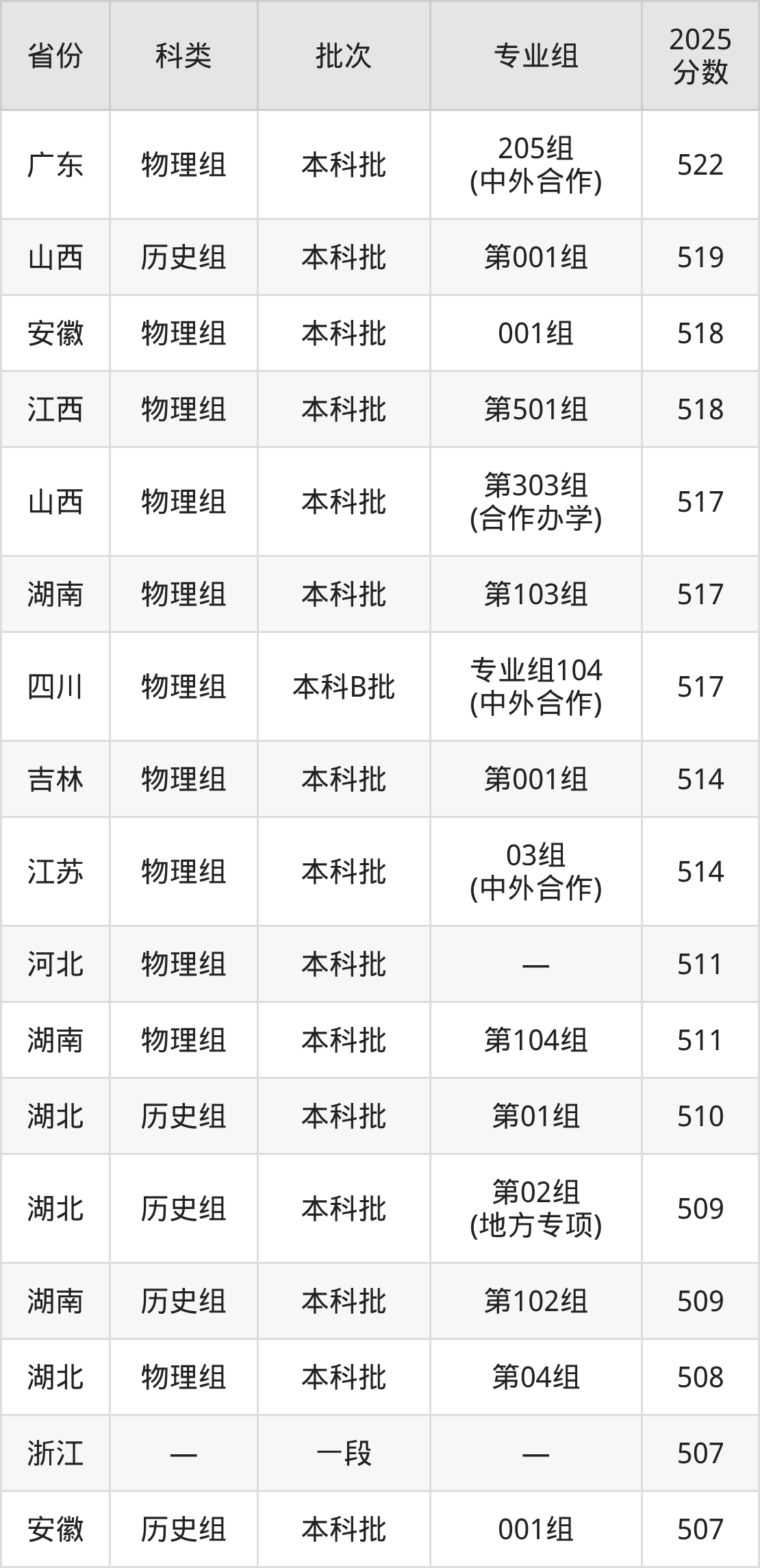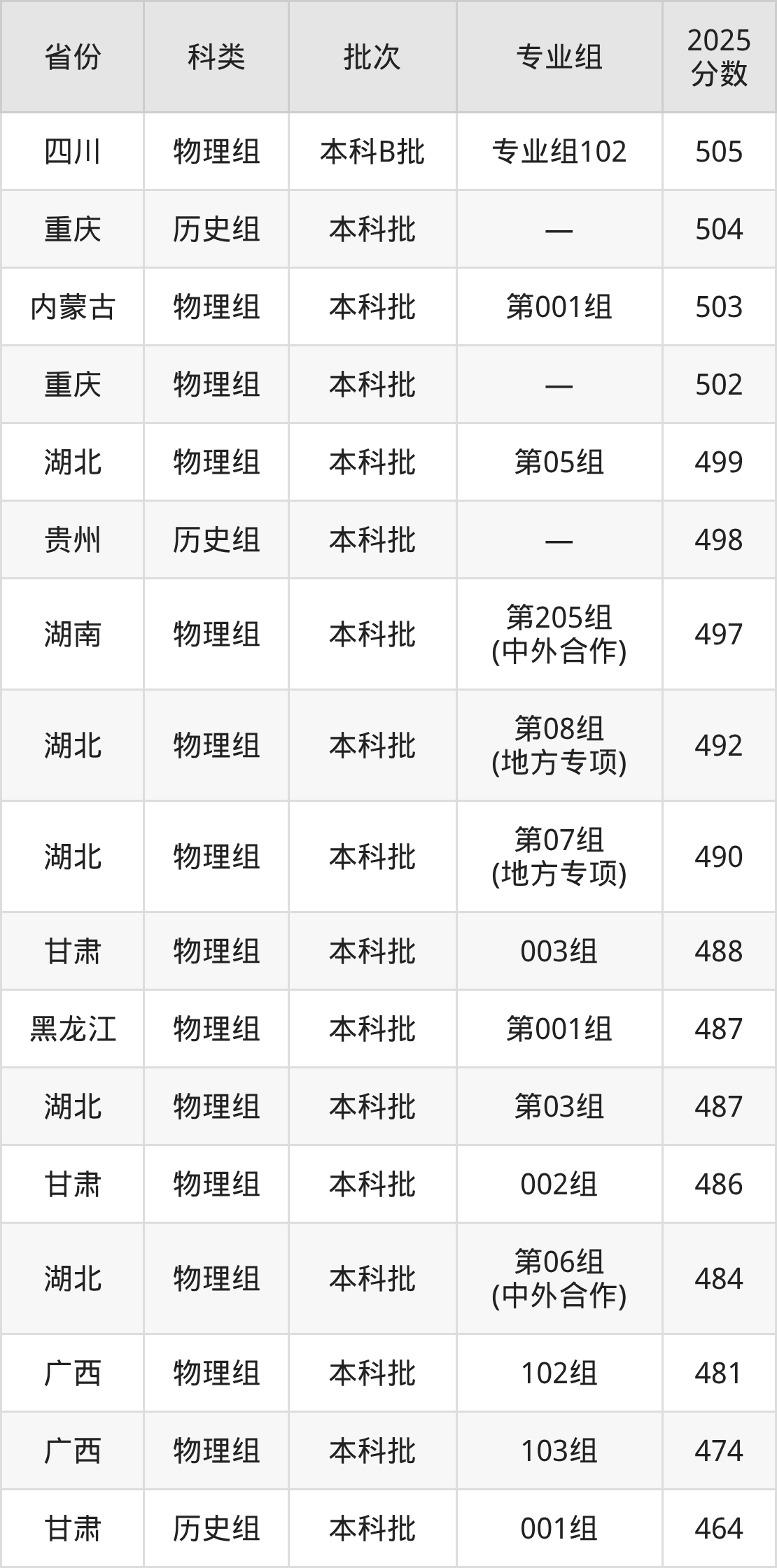 2025年湖北汽车工业学院在全国普通批次招生的录取分数范围位于439~566分之间,其中省内分数范围为484分~510分,历史组最低分专业组为“第02组(地方专项)”,考生509分即可报考,物理组最低分专业组为“第06组(中外合作)”,考生484分即可报考。