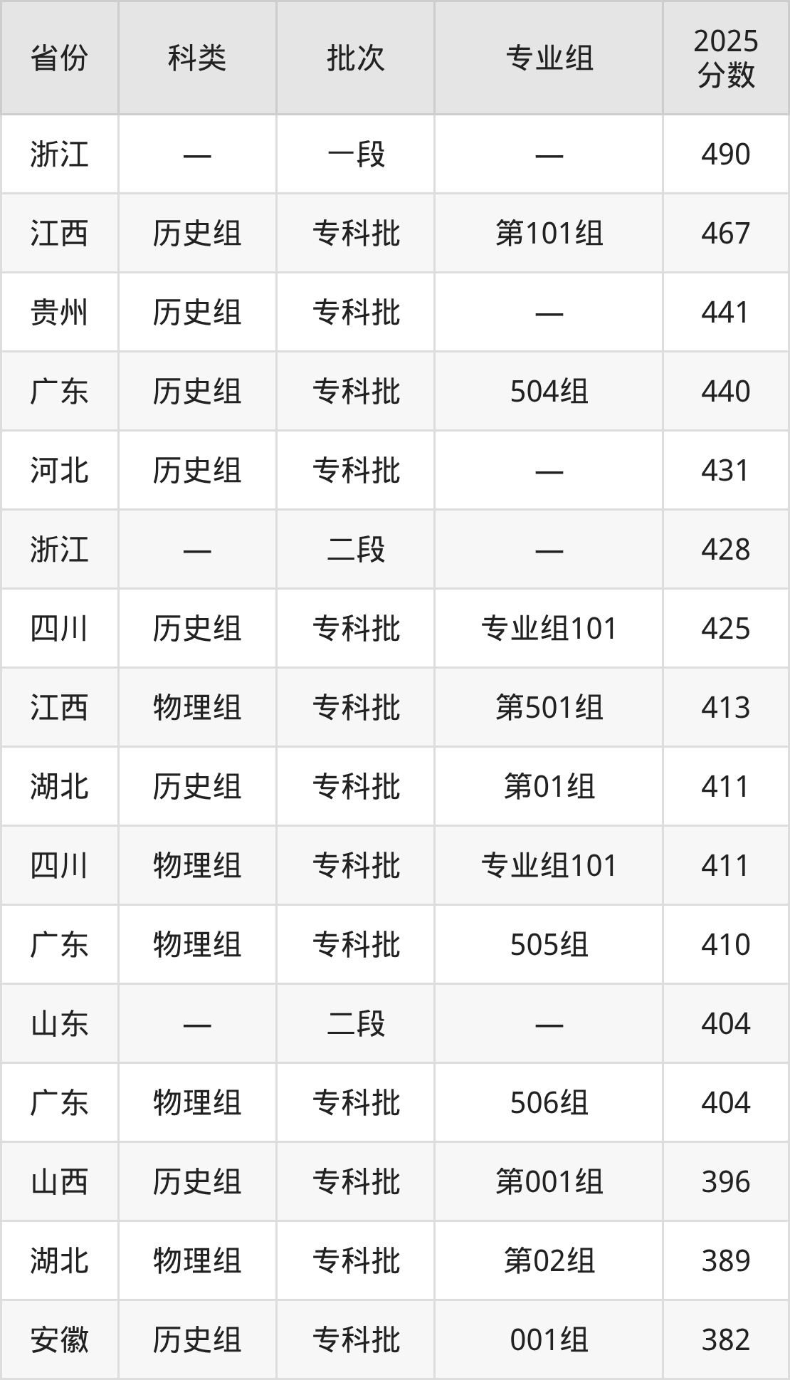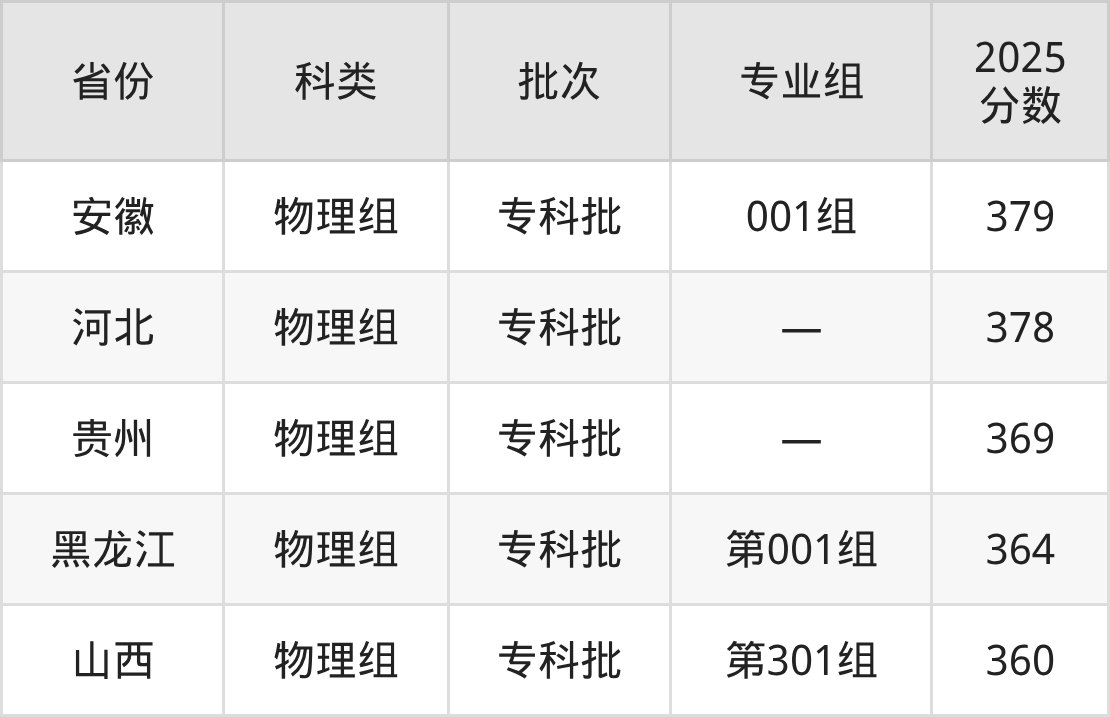 2025年淮南联合大学在全国普通批次招生的录取分数范围位于360~490分之间,其中省内分数范围为379分~382分,历史组最低分专业组为“001组”,考生382分即可报考,物理组最低分专业组为“001组”,考生379分即可报考。