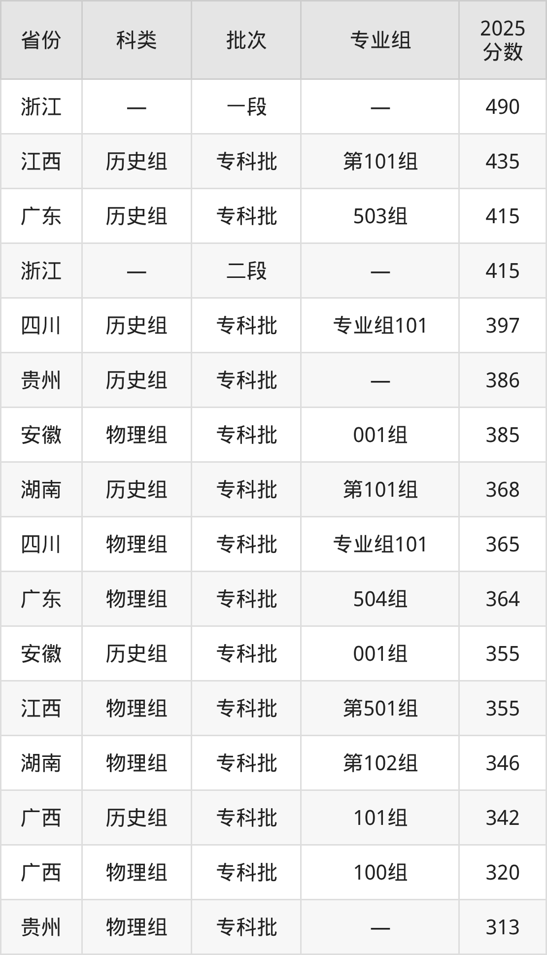 而浙江地区考生的分数门槛最高,2025年闽西职业技术学院在浙江招生最低分为490分,考生至少要超一段线0分才有可能被录取。