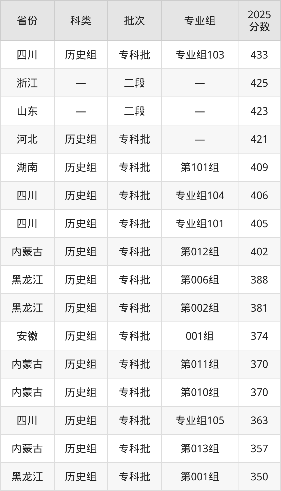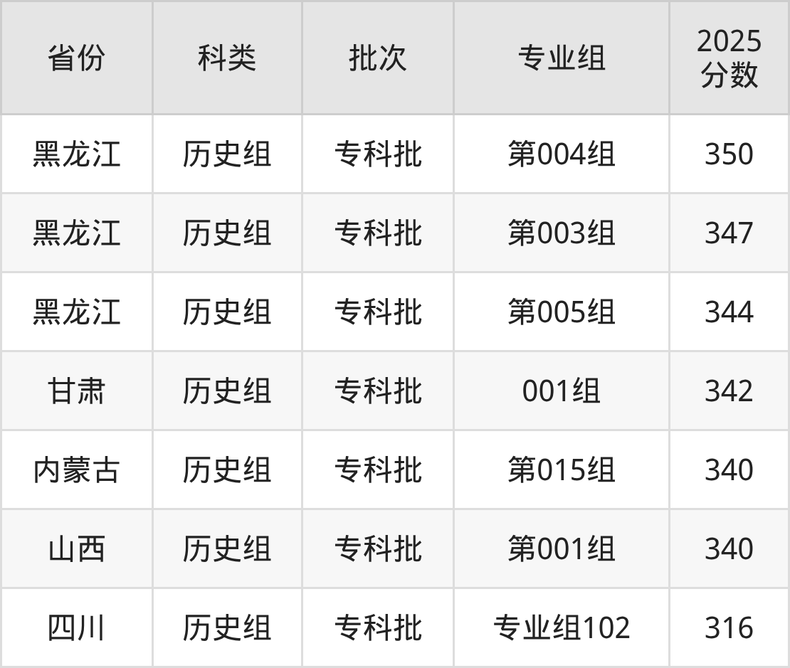 天津艺术职业学院在市外招生的最低分为316分,其中四川地区历史组考生上天津艺术职业学院的分数门槛最低,考生成绩超专科线166分(316分)可上。其次是内蒙古历史组考生,上天津艺术职业学院至少要超专科线180分(340分)。