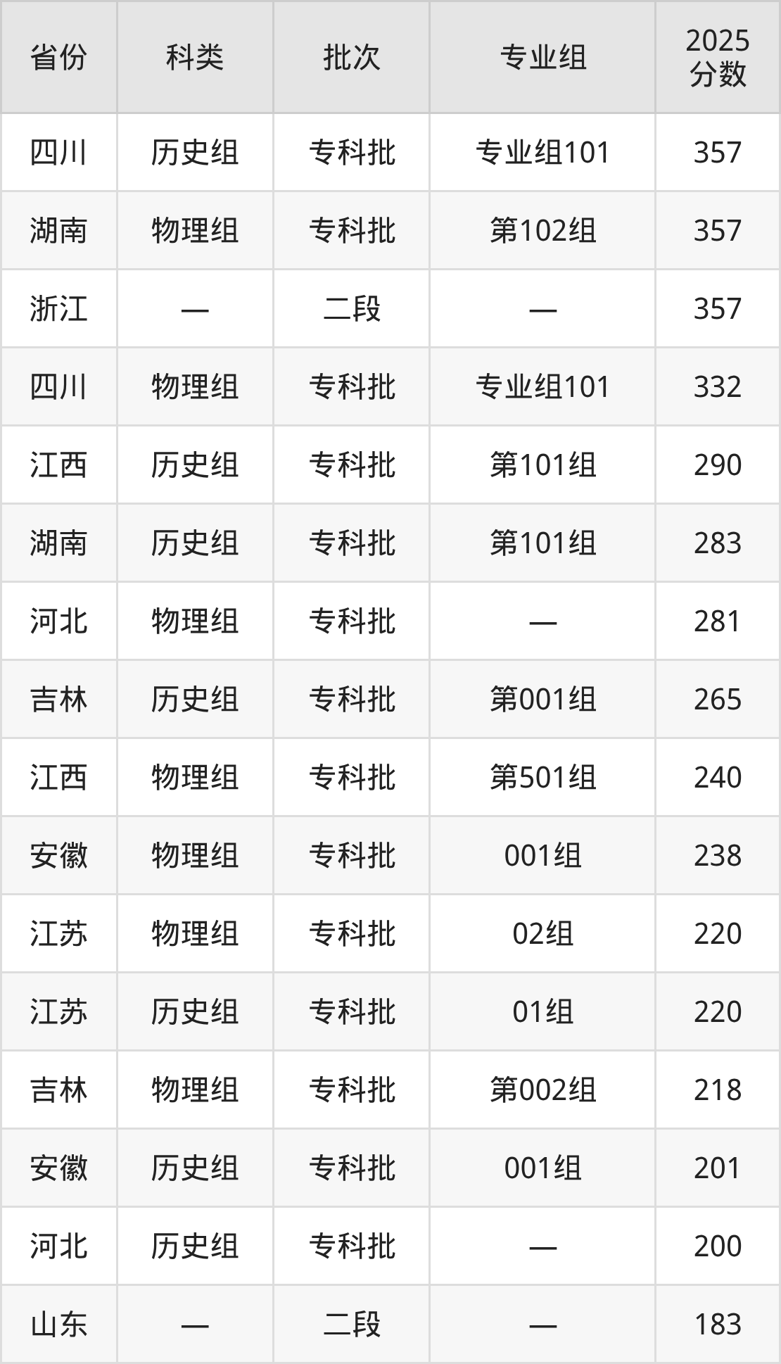 2025年宿迁泽达职业技术学院在全国普通批次招生的录取分数范围位于183~357分之间,其中省内分数在220分,物理组最低分专业组为“02组”,考生220分即可报考,历史组最低分专业组为“01组”,考生220分即可报考。