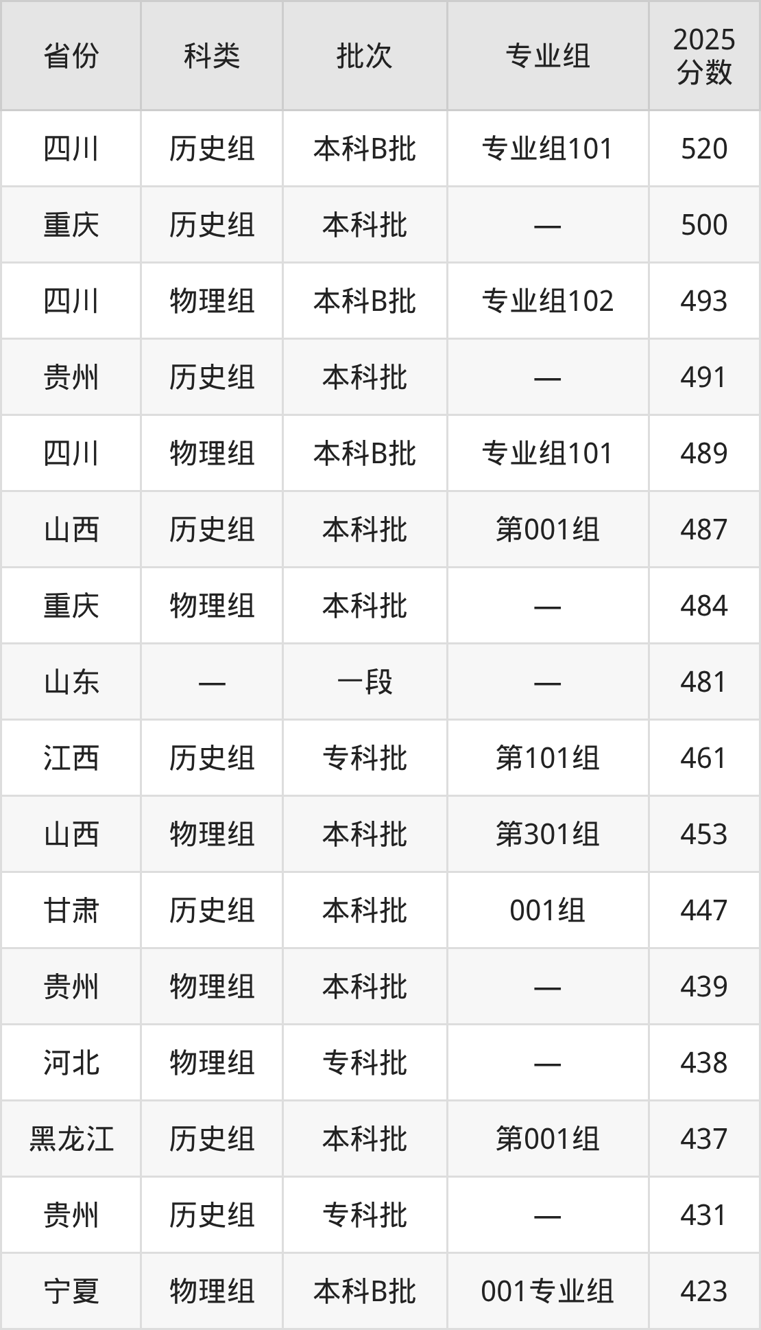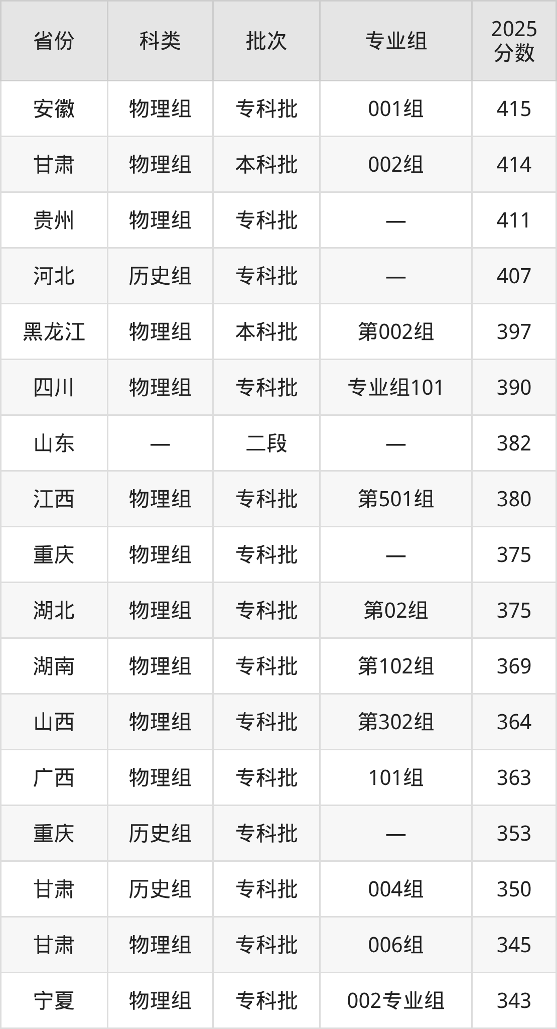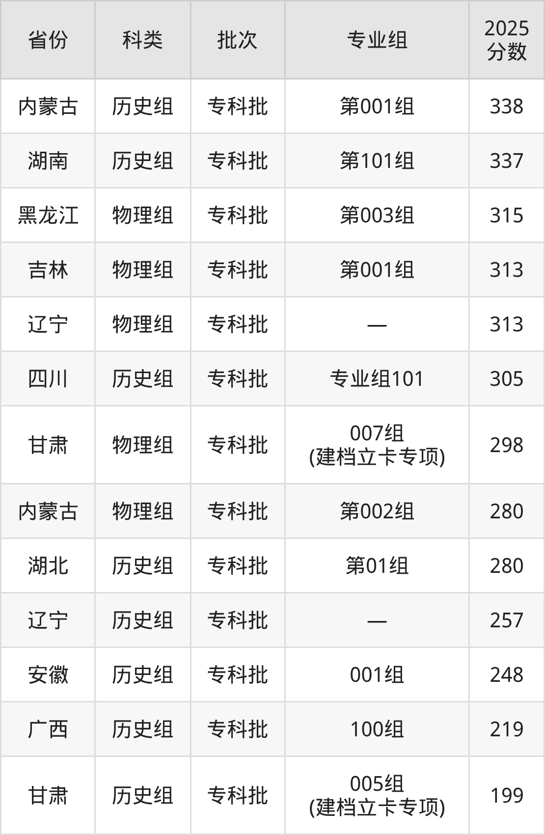 下面是酒泉职业技术大学2025年在全国各省的录取分数线一览表,供参考: