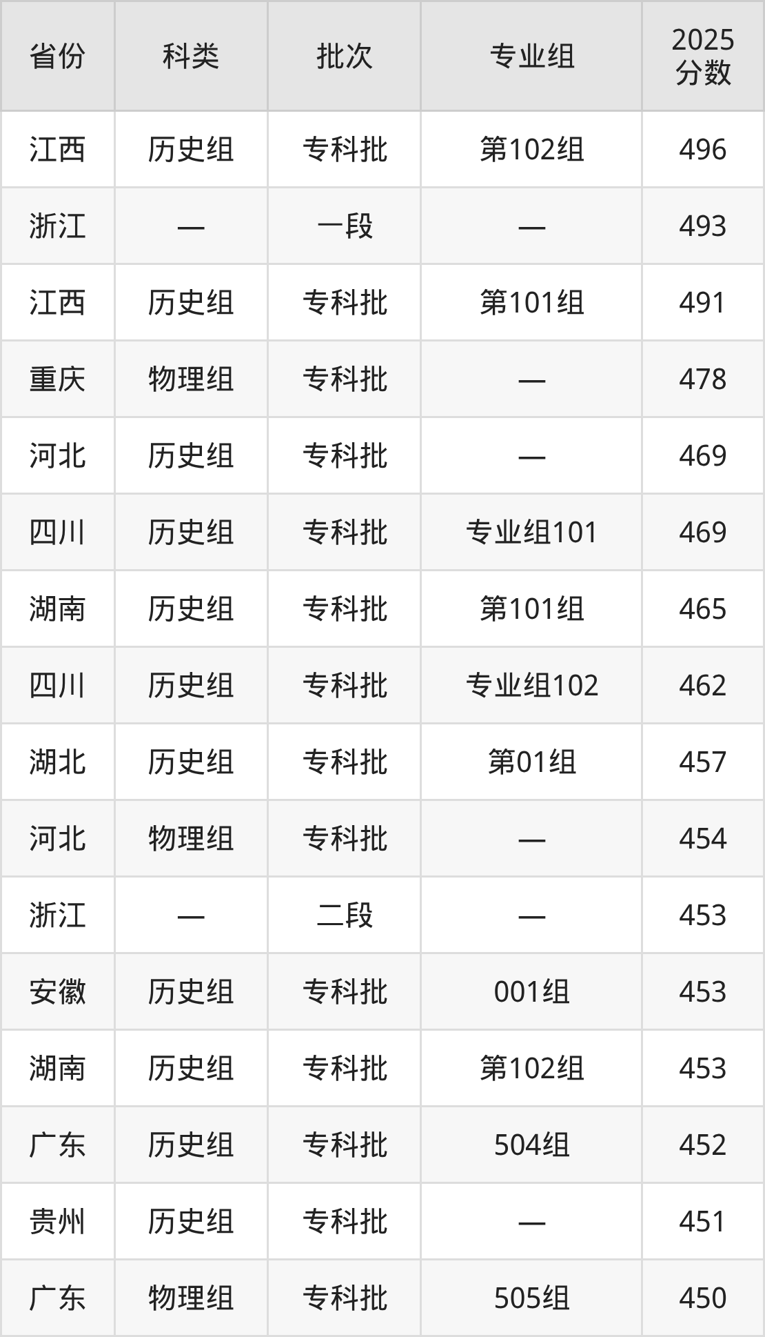 而江西地区历史组考生的分数门槛最高,2025年武汉软件工程职业学院第102组在江西招生最低分为496分,考生至少要超专科线206分才有可能被录取。