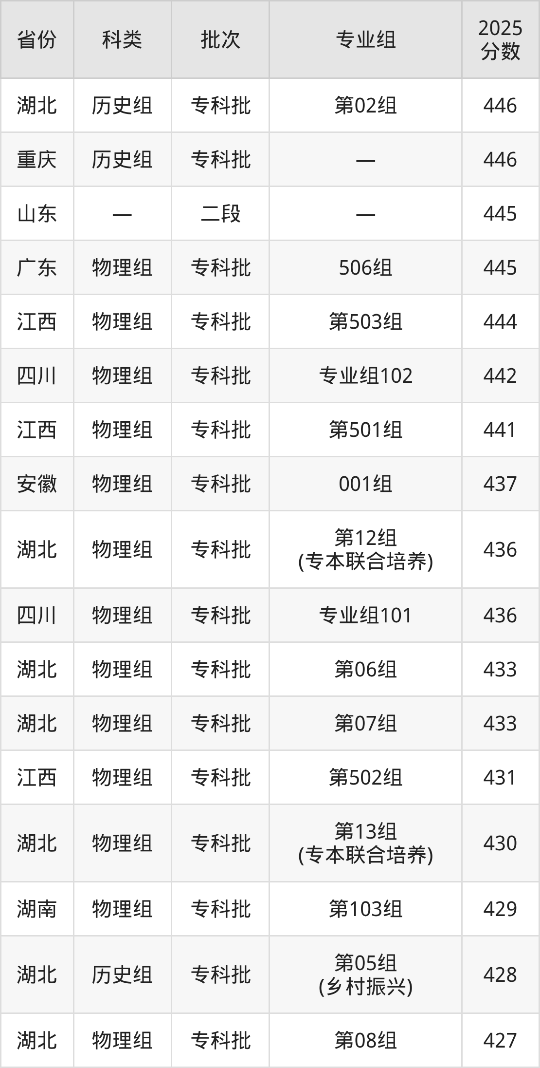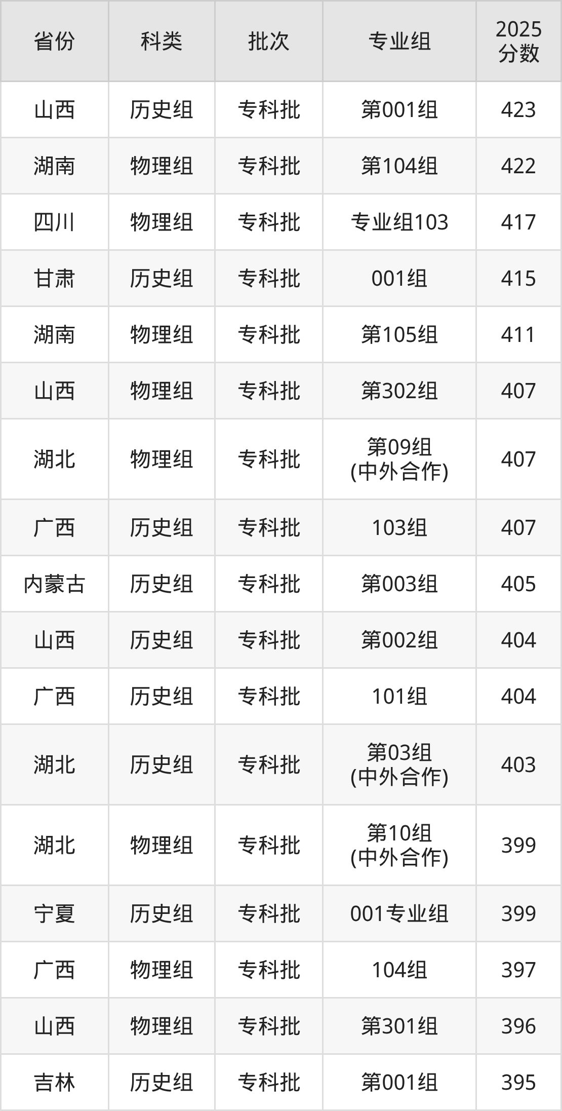 武汉软件工程职业学院2026年录取分数需在高招结束官方数据公布后更新,2026届有意向报考该校的同学,可以在填报志愿时参考武汉软件工程职业学院2025年录取分数线: