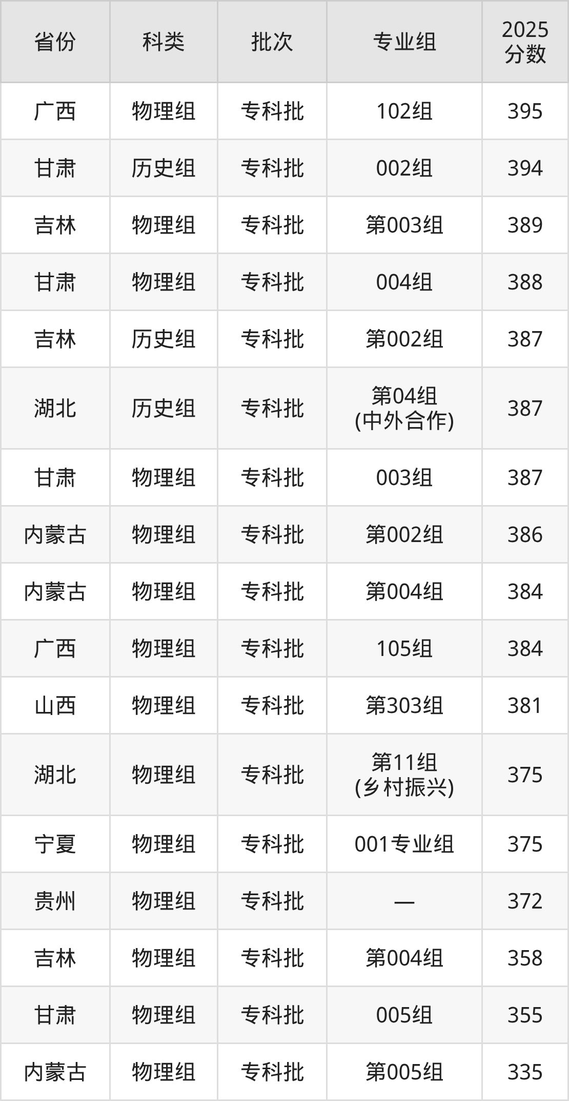 武汉软件工程职业学院在省外招生的最低分为335分,其中内蒙古地区物理组考生上武汉软件工程职业学院的分数门槛最低,考生成绩超专科线175分(335分)可上。其次是甘肃物理组考生,上武汉软件工程职业学院至少要超专科线175分(355分)。