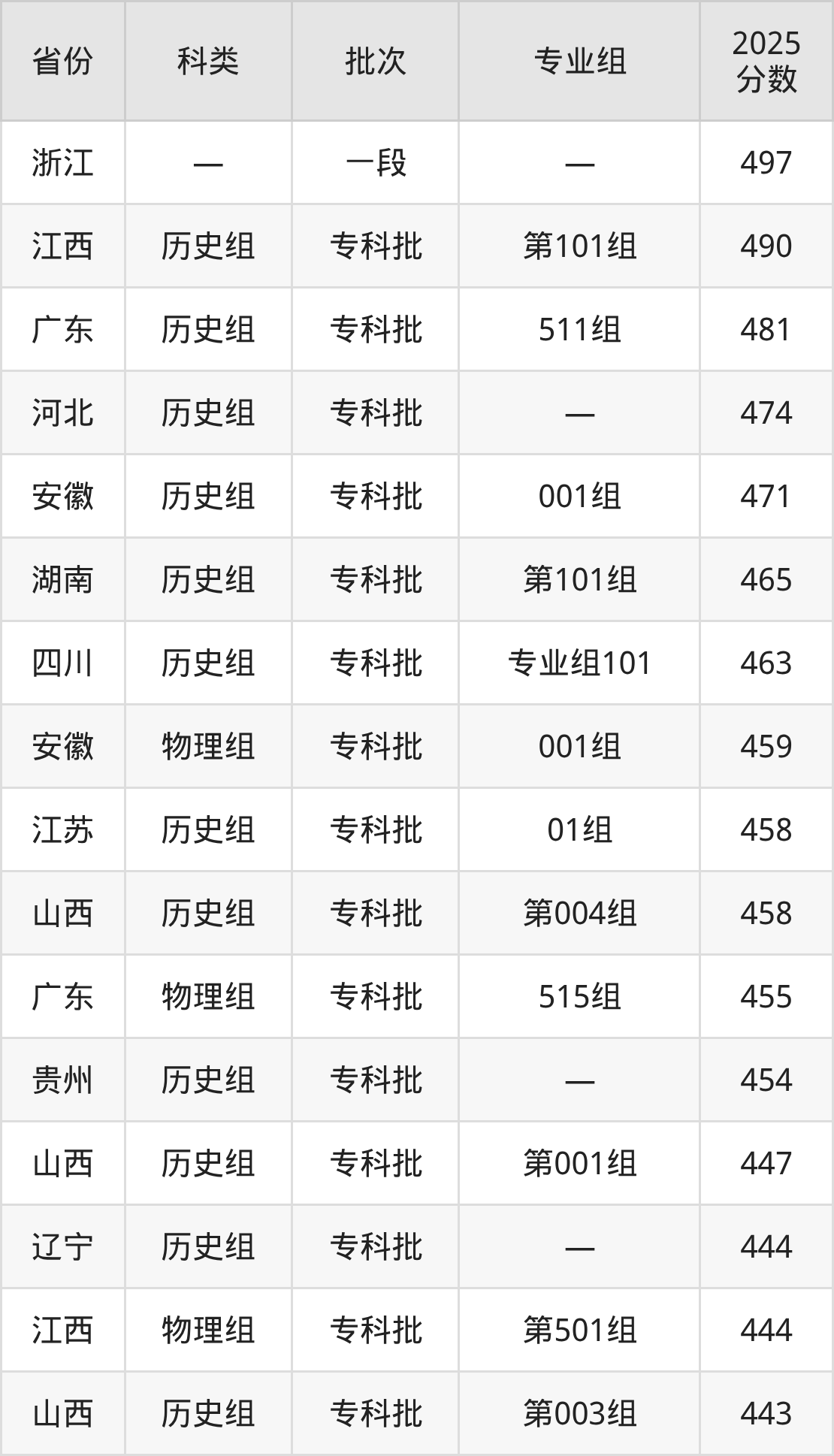 而浙江地区考生的分数门槛最高,2025年湖南铁道职业技术学院在浙江招生最低分为497分,考生至少要超一段线7分才有可能被录取。