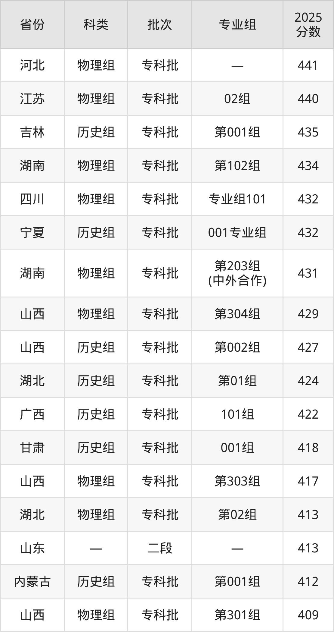 下面是湖南铁道职业技术学院2025年在全国各省的录取分数线一览表,供参考: