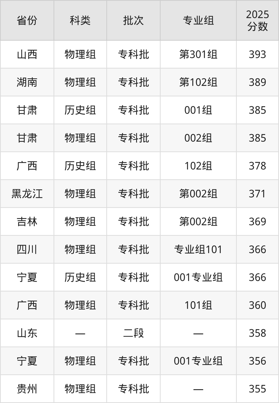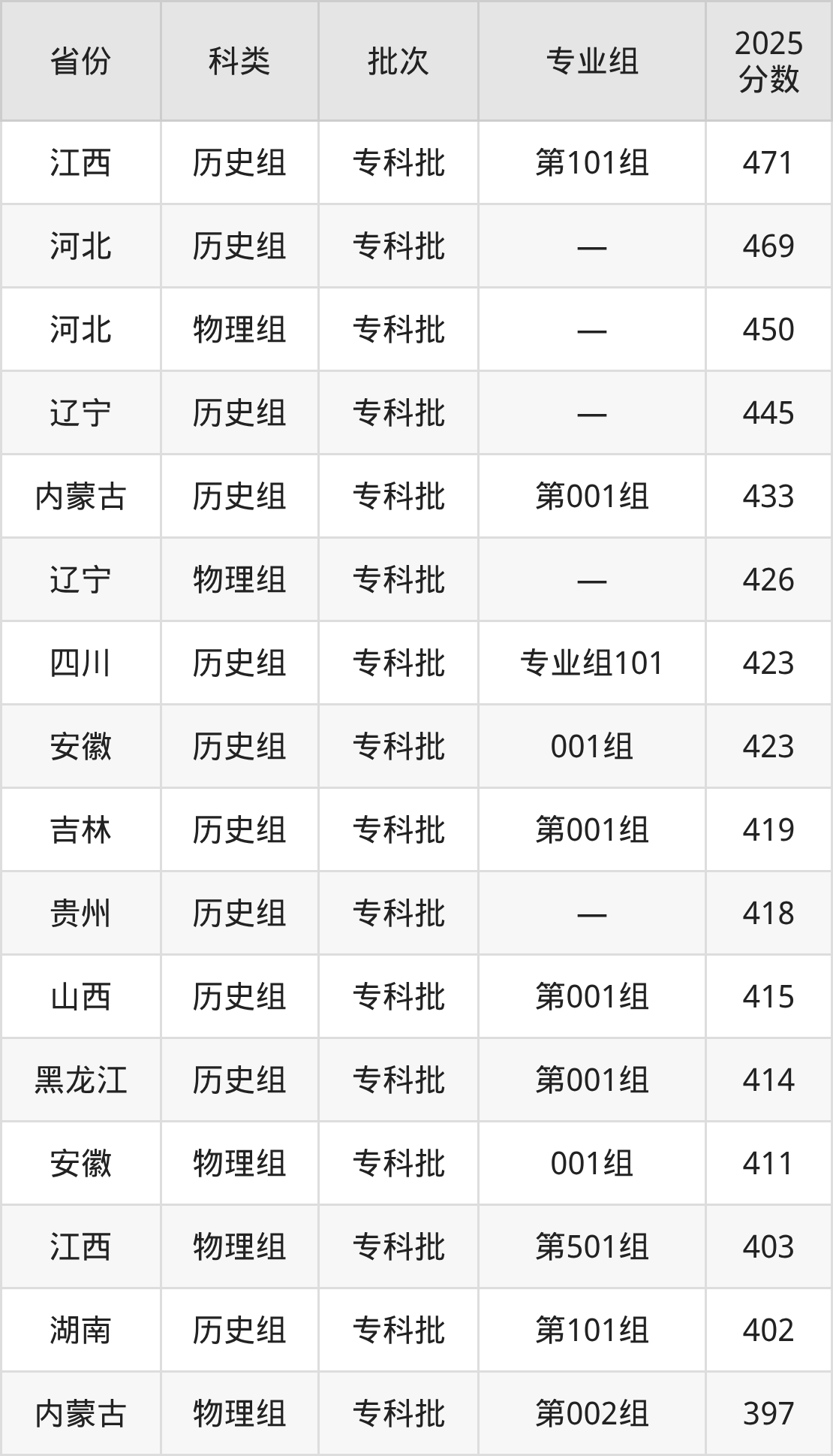 而江西地区历史组考生的分数门槛最高,2025年济南护理职业学院第101组在江西招生最低分为471分,考生至少要超专科线181分才有可能被录取。