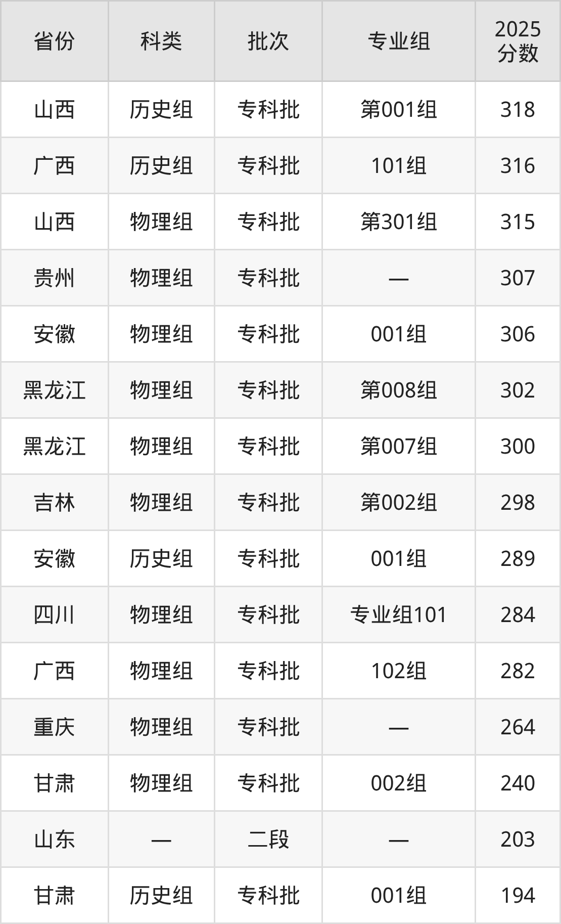 黑龙江农垦职业学院在省内招生最低录取分数线为300分,在省外招生最低录取分数线为194分,不同地区、不同科类的考生最低分有差异。