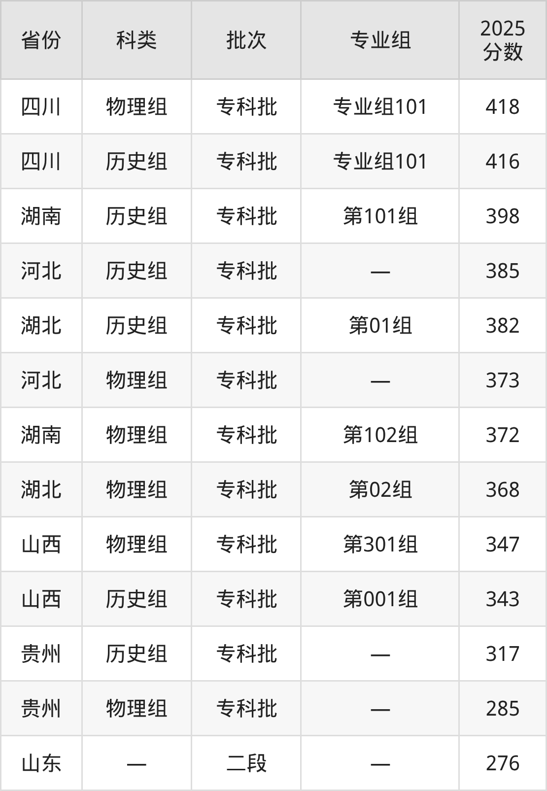 而四川地区物理组考生的分数门槛最高,2025年三门峡社会管理职业学院专业组101在四川招生最低分为418分,考生至少要超专科线268分才有可能被录取。