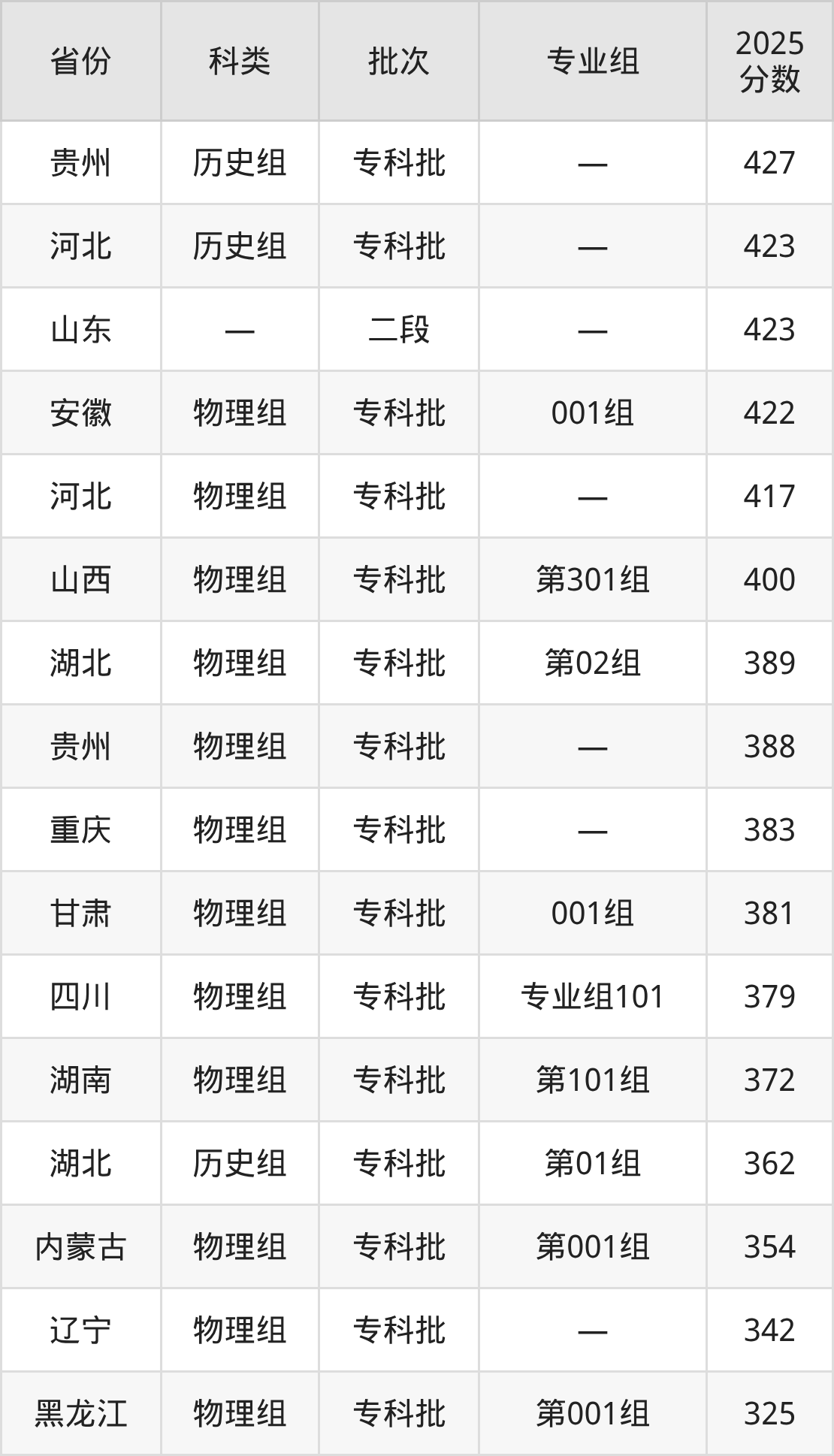 而贵州地区历史组考生的分数门槛最高,2025年河南工业职业技术学院在贵州招生最低分为427分,考生至少要超专科线247分才有可能被录取。