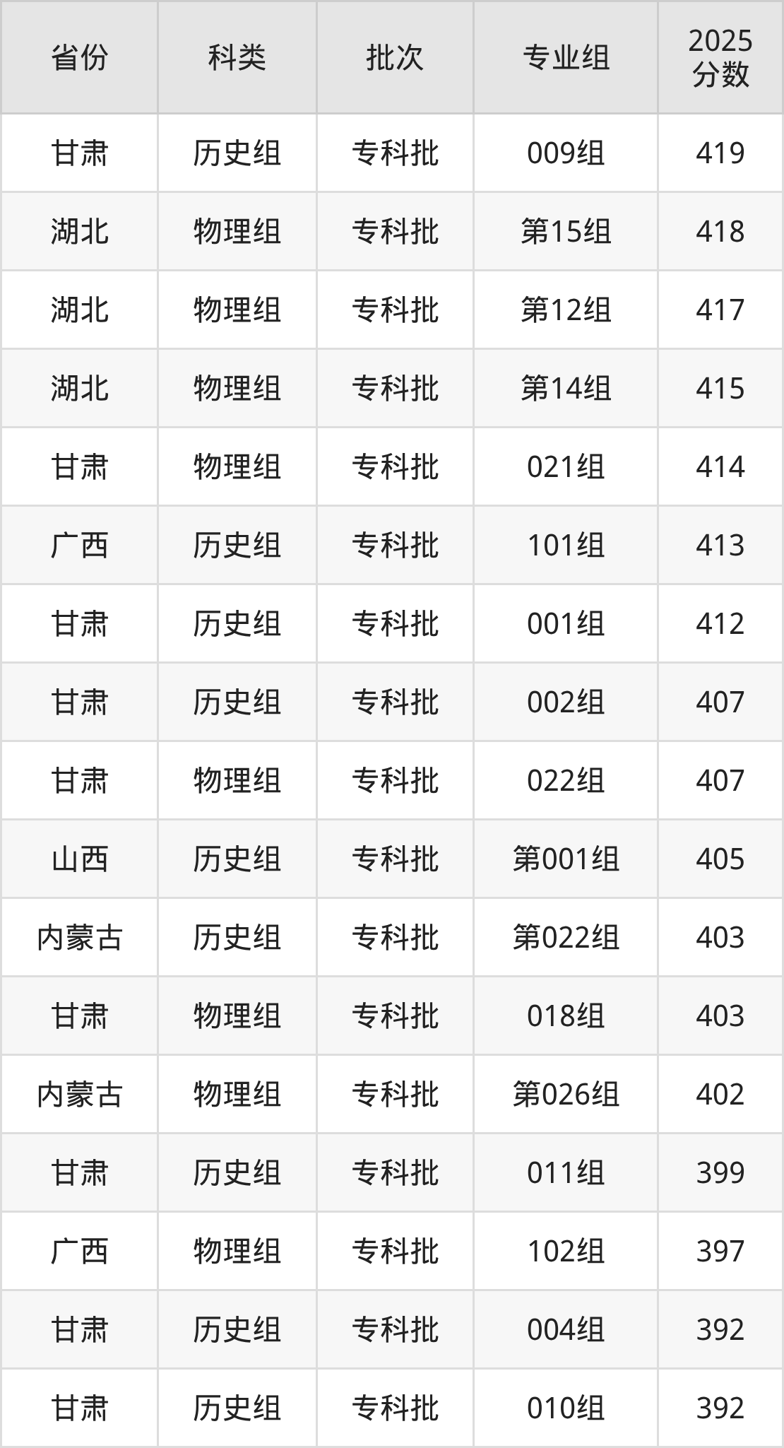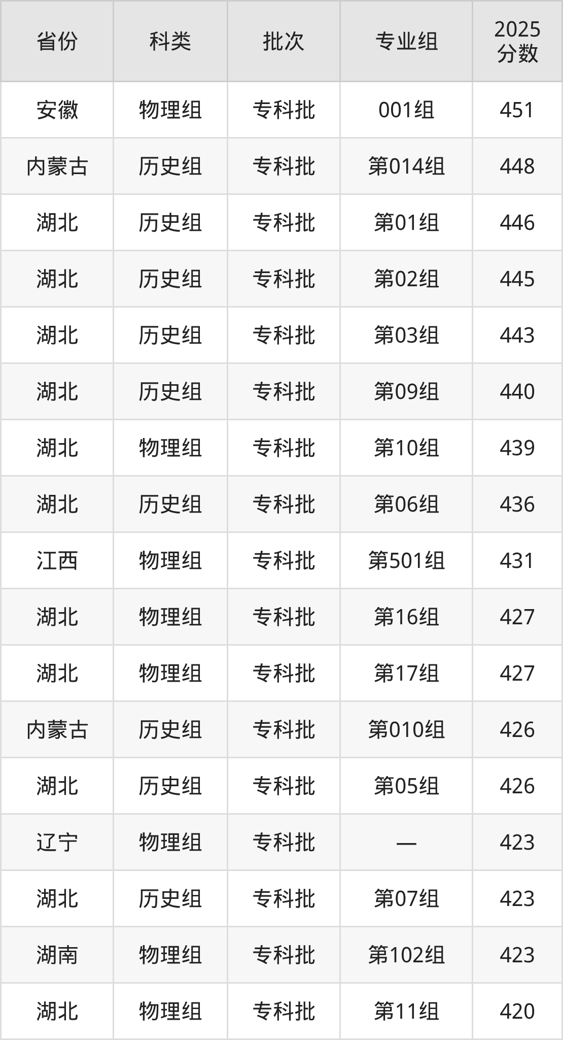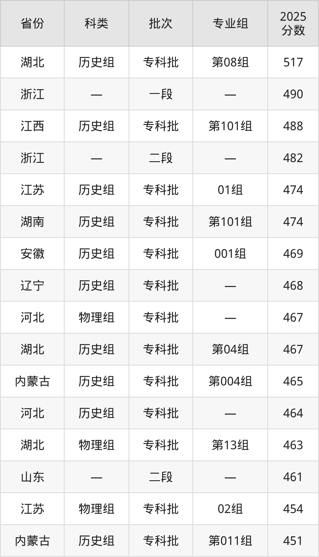 而湖北地区历史组考生的分数门槛最高,2025年浙江经贸职业技术学院第08组在湖北招生最低分为517分,考生至少要超专科线317分才有可能被录取。