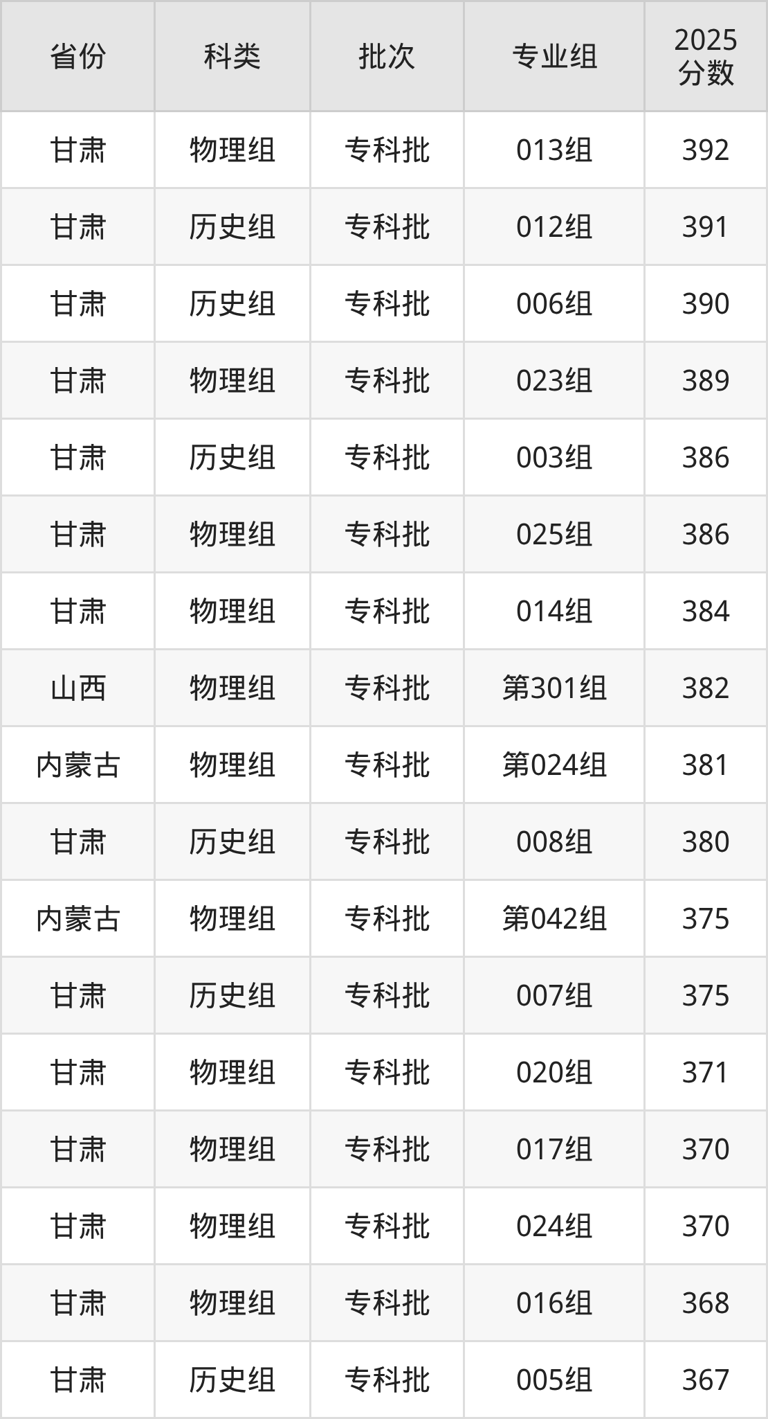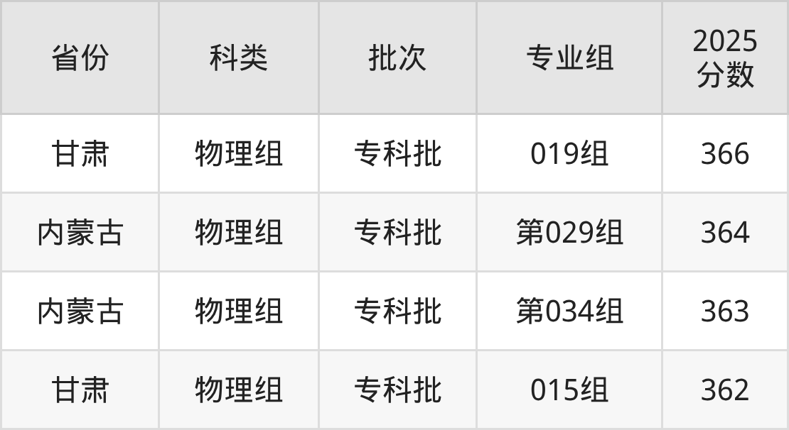 浙江经贸职业技术学院在省外招生的最低分为362分,其中甘肃地区物理组考生上浙江经贸职业技术学院的分数门槛最低,考生成绩超专科线182分(362分)可上。其次是内蒙古物理组考生,上浙江经贸职业技术学院至少要超专科线203分(363分)。