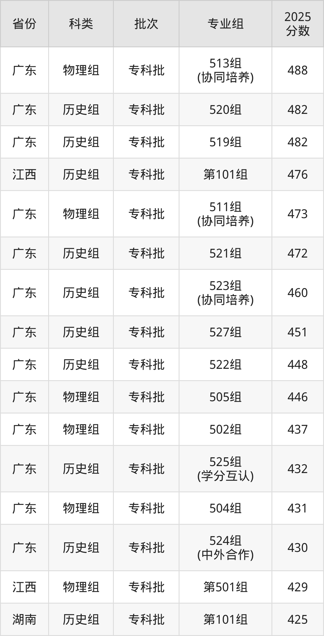而江西地区历史组考生的分数门槛最高,2025年广东水利电力职业技术学院第101组在江西招生最低分为476分,考生至少要超专科线186分才有可能被录取。
