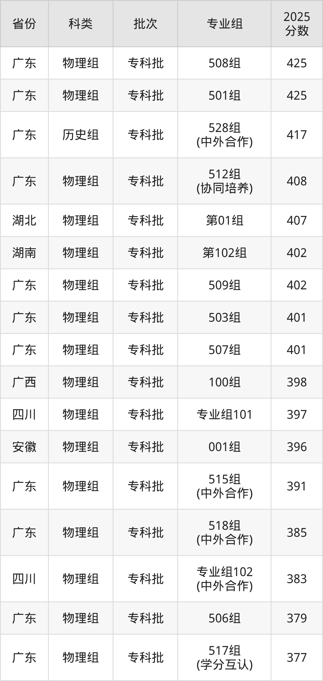 2025年广东水利电力职业技术学院在全国普通批次招生的录取分数范围位于244~488分之间,其中省内分数范围为365分~488分,物理组最低分专业组为“516组(学分互认)”,考生365分即可报考,历史组最低分专业组为“528组(中外合作)”,考生417分即可报考。