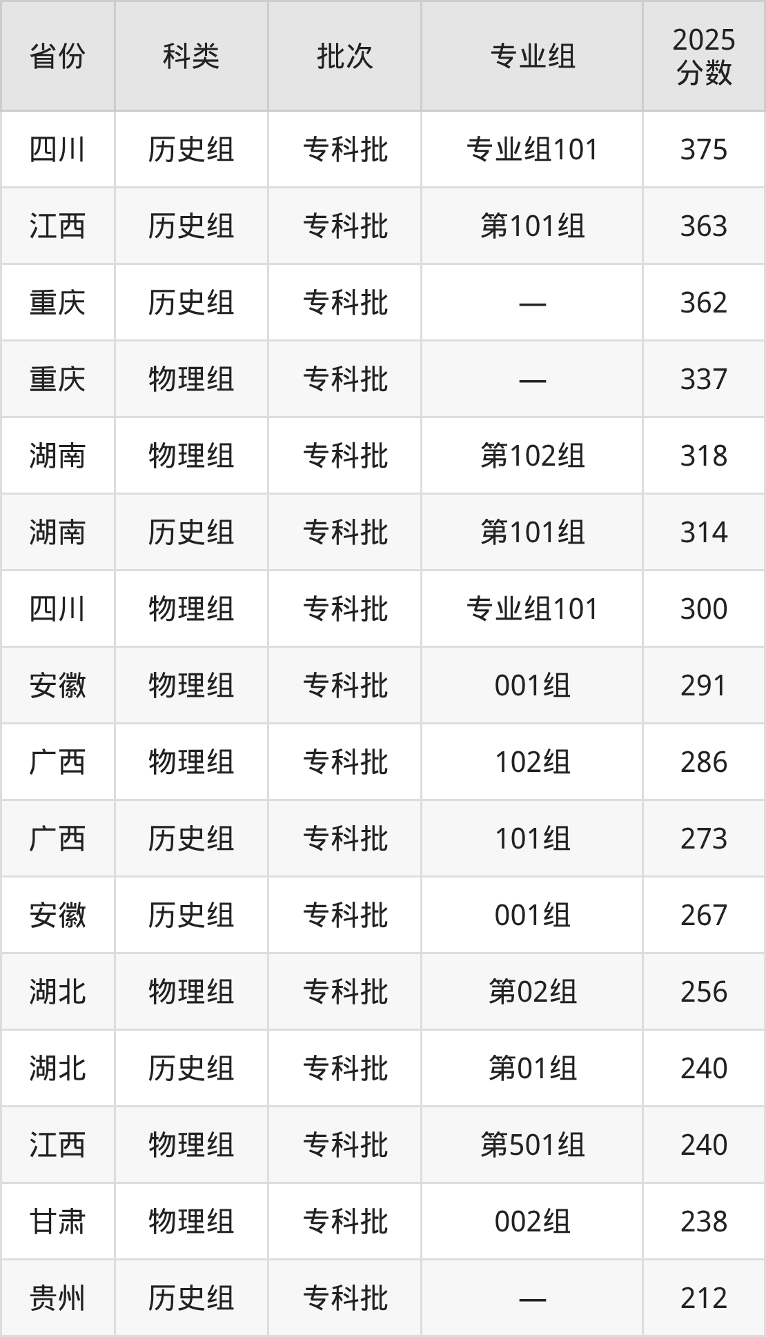 而四川地区历史组考生的分数门槛最高,2025年毕节职业技术学院专业组101在四川招生最低分为375分,考生至少要超专科线225分才有可能被录取。