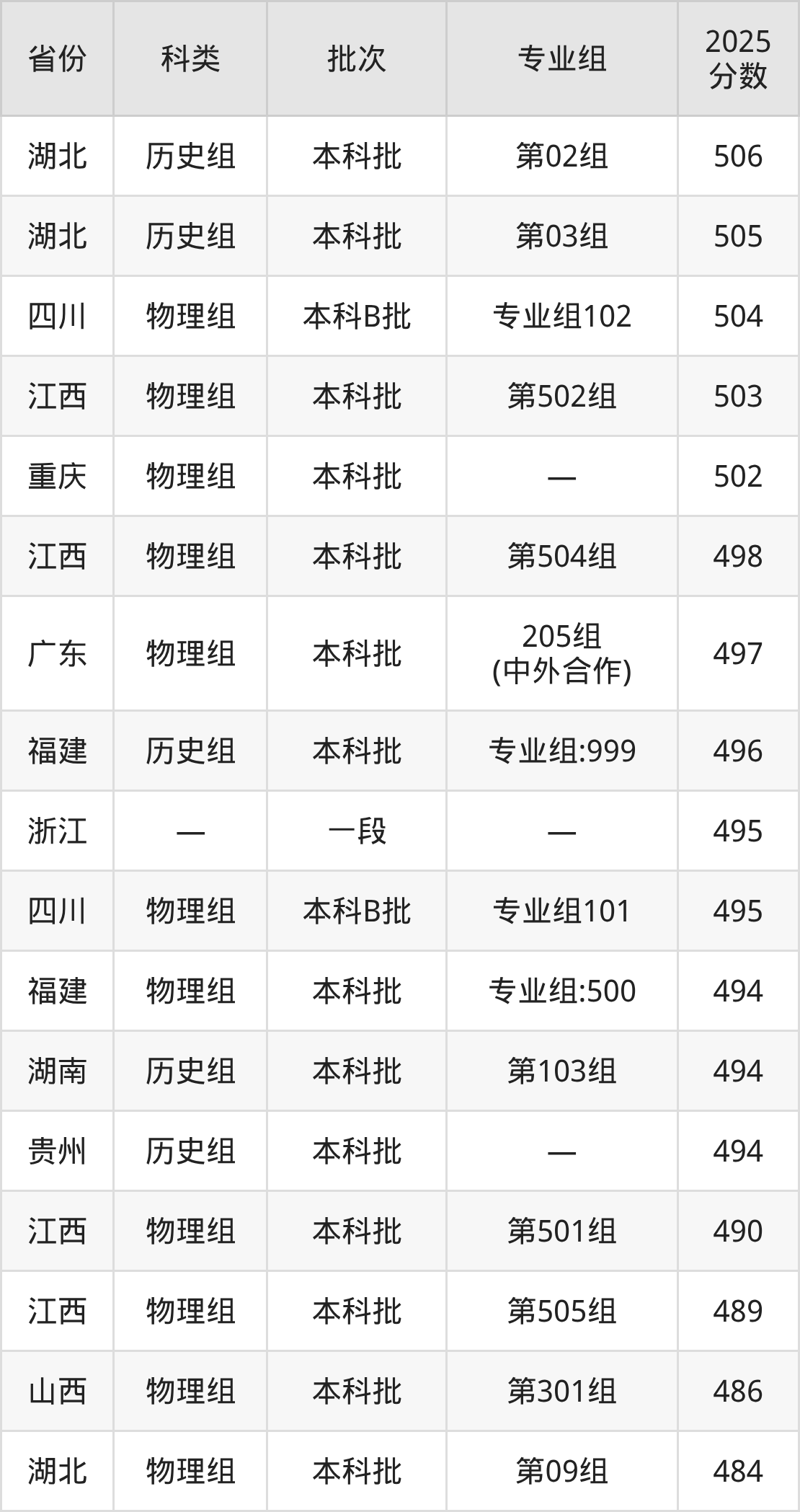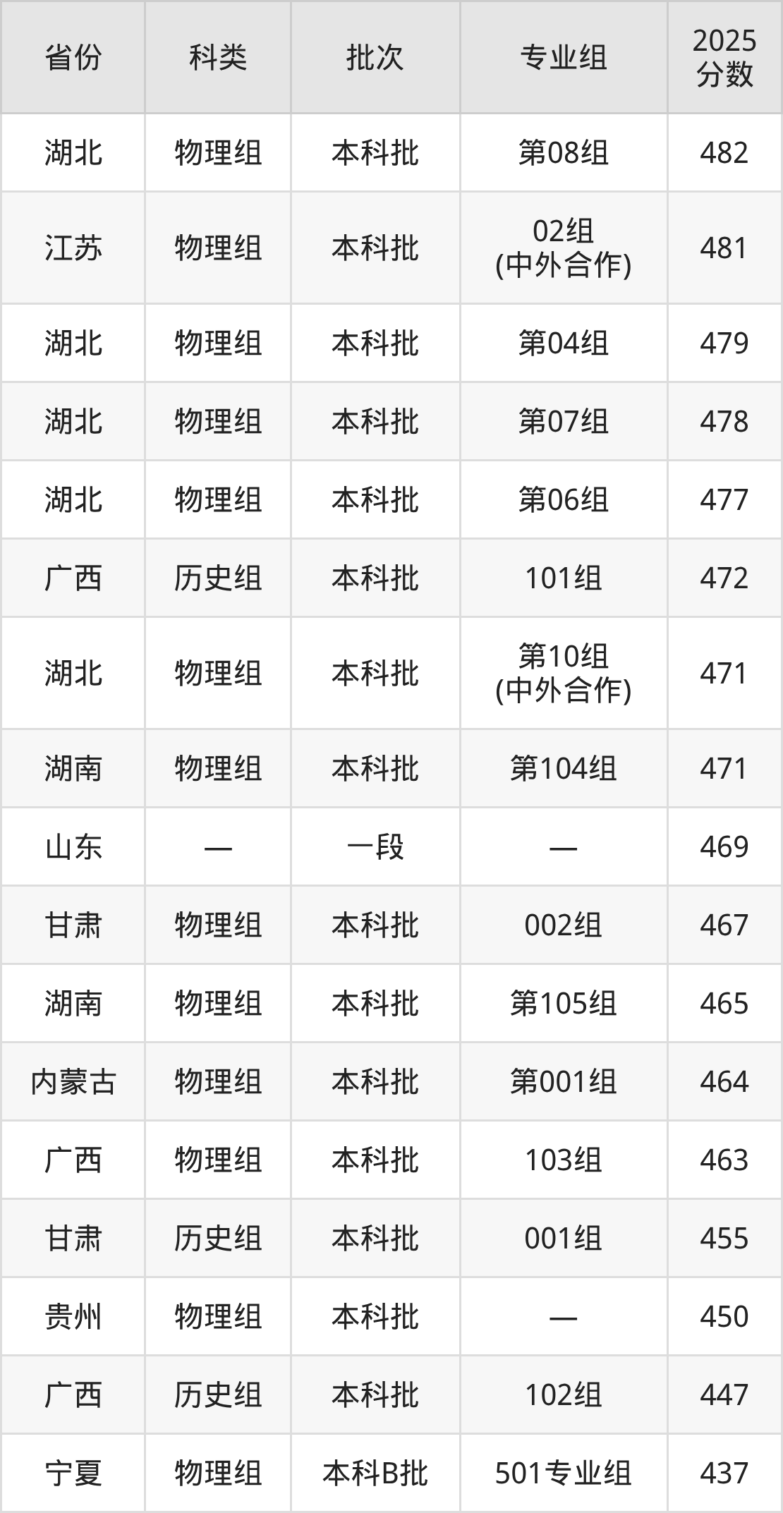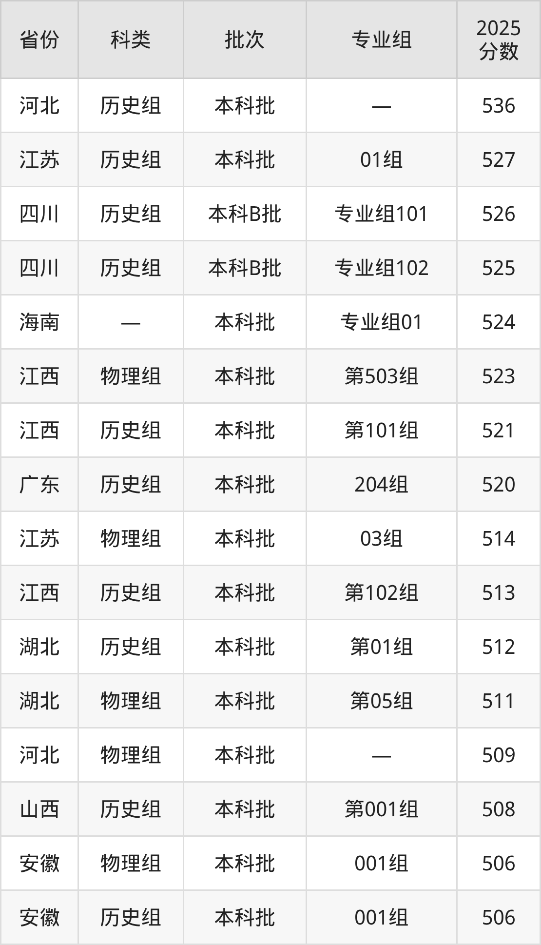 2025年荆楚理工学院在全国普通批次招生的录取分数范围位于437~536分之间,其中省内分数范围为471分~512分,历史组最低分专业组为“第03组”,考生505分即可报考,物理组最低分专业组为“第10组(中外合作)”,考生471分即可报考。