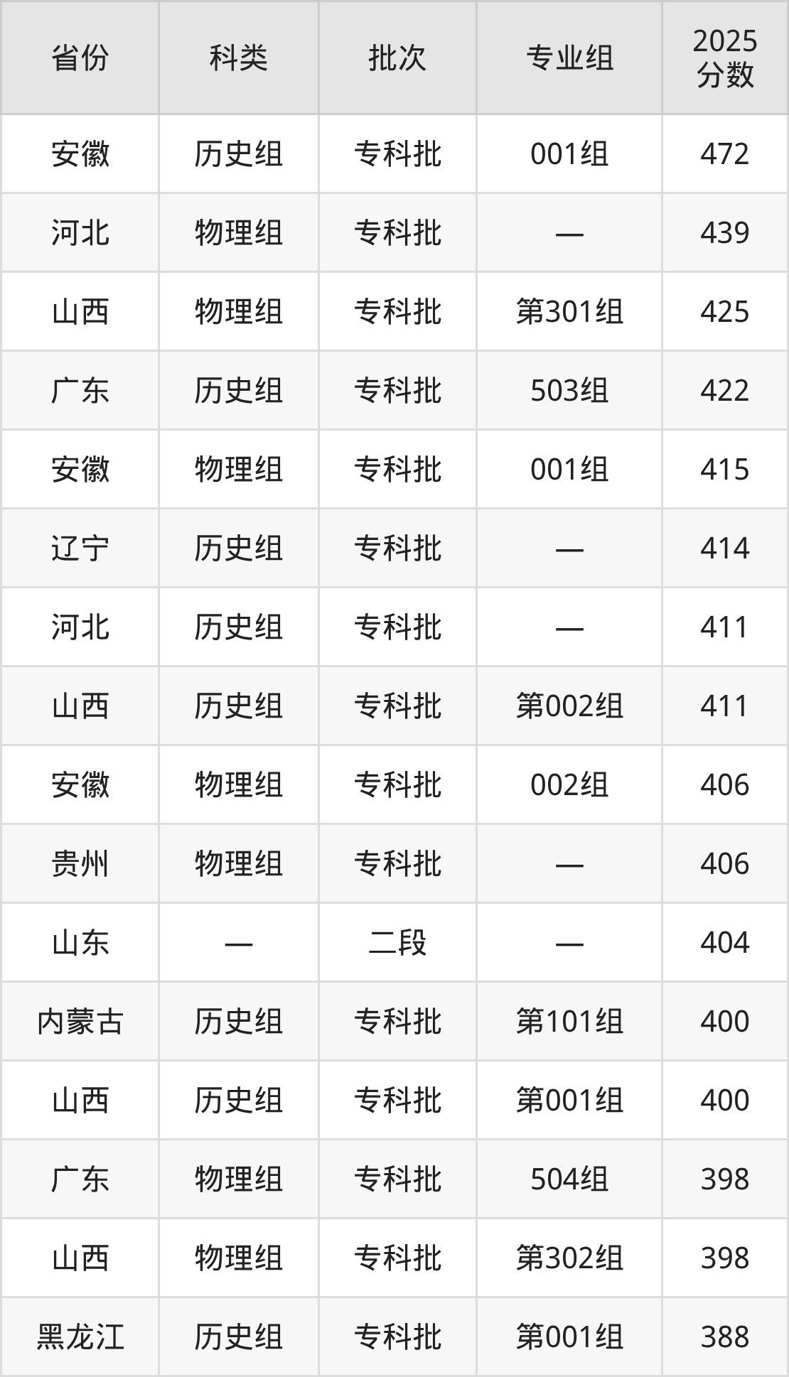 而安徽地区历史组考生的分数门槛最高,2025年广元中核职业技术学院001组在安徽招生最低分为472分,考生至少要超专科线272分才有可能被录取。