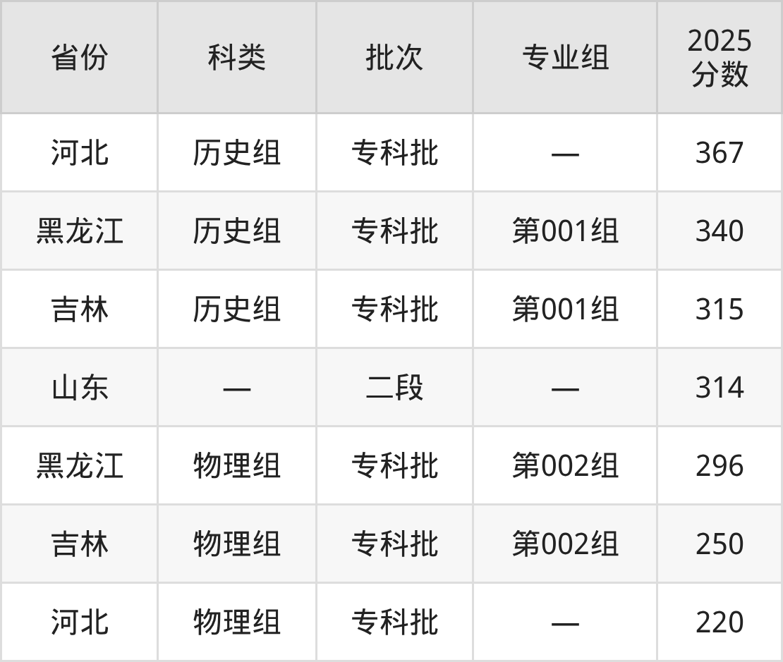 下面是延边职业技术学院2025年在全国各省的录取分数线一览表,供参考: