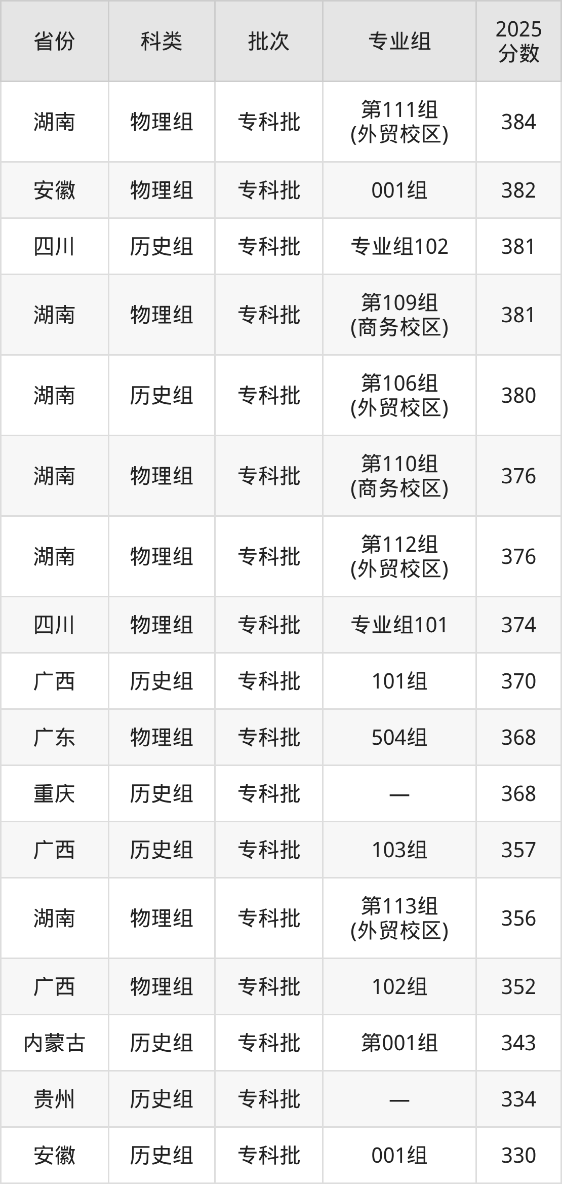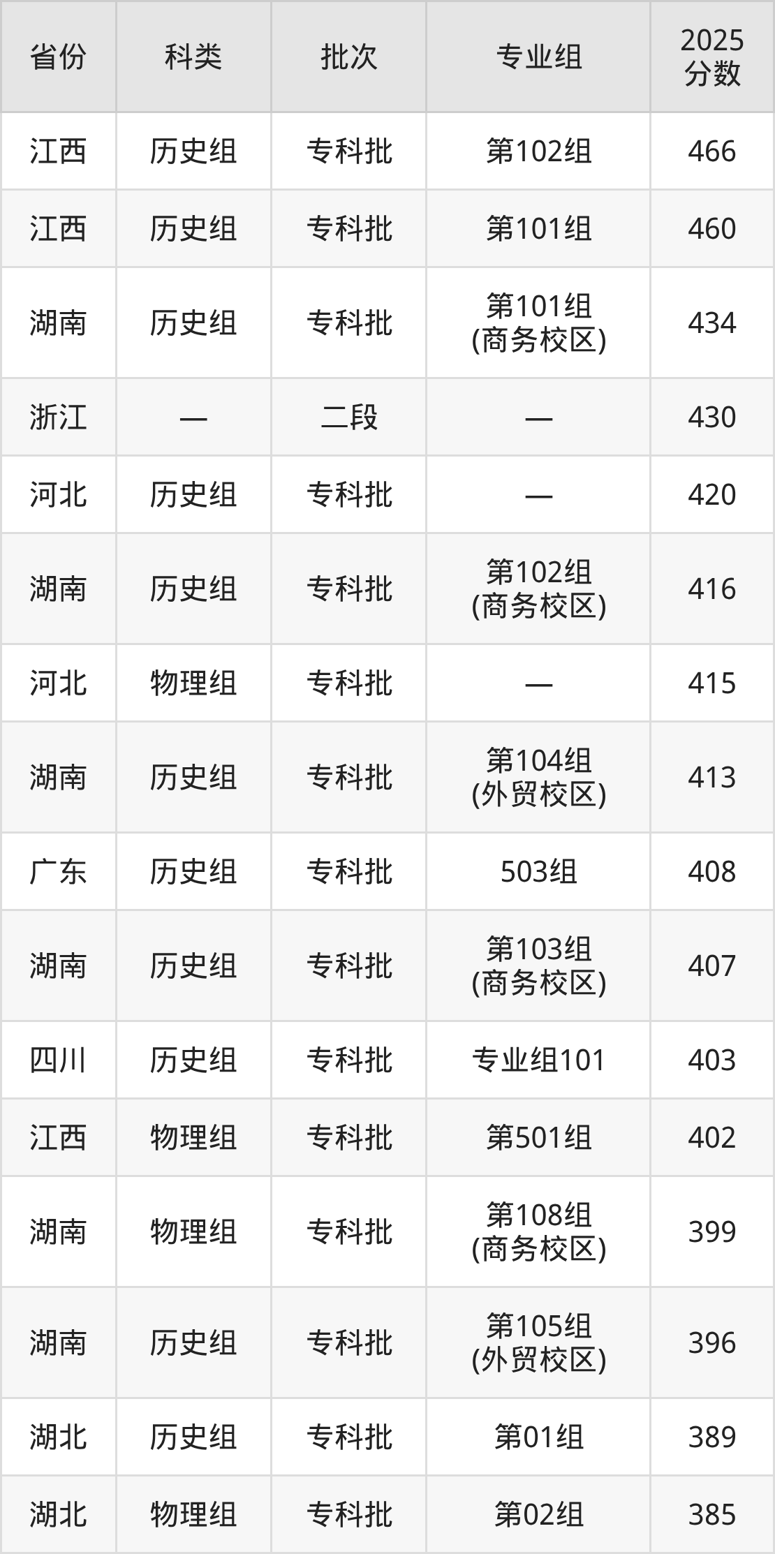 而江西地区历史组考生的分数门槛最高,2025年湖南商务职业技术学院第102组在江西招生最低分为466分,考生至少要超专科线176分才有可能被录取。