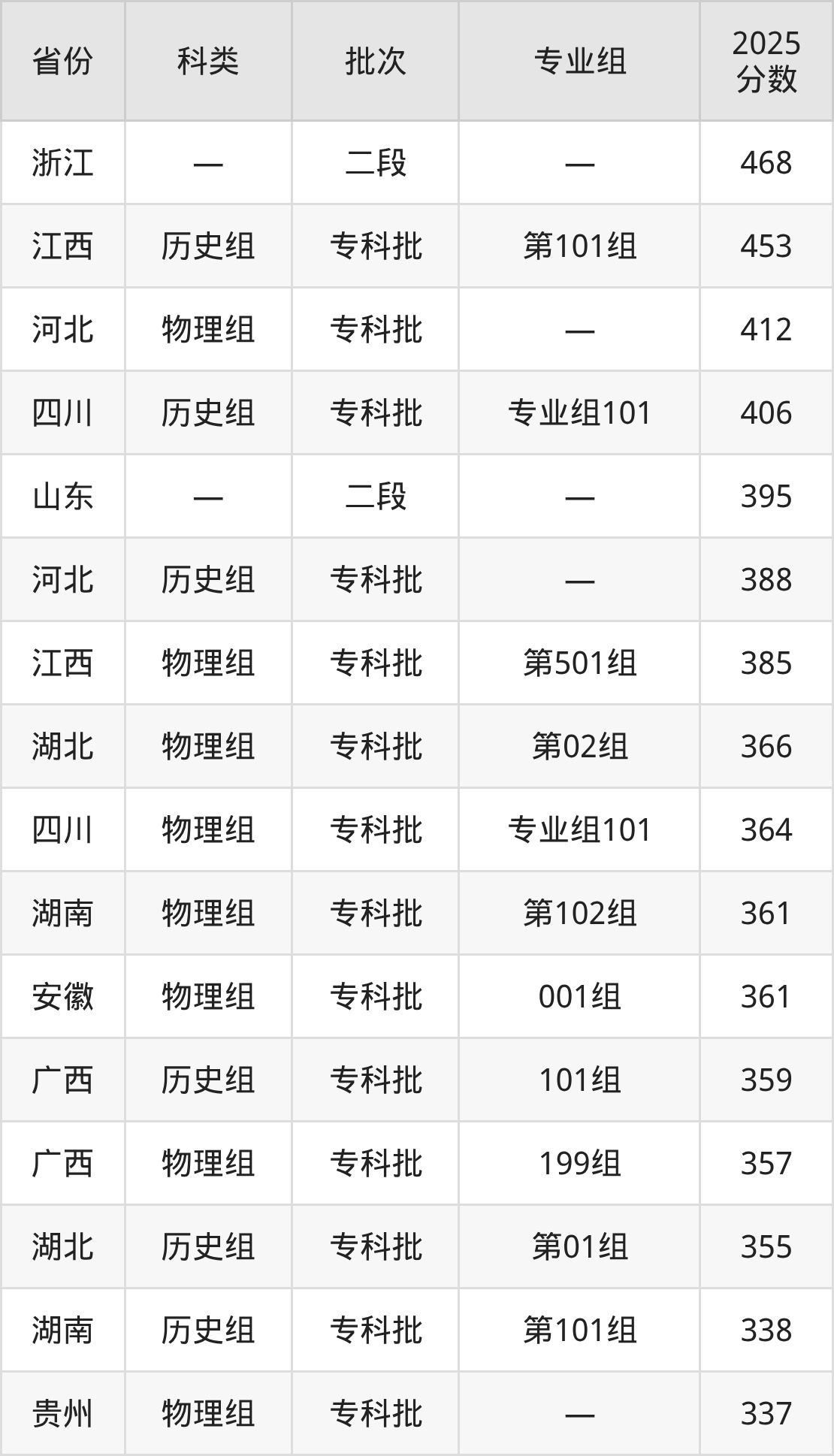 而浙江地区考生的分数门槛最高,2025年湄洲湾职业技术学院在浙江招生最低分为468分,考生至少要超二段线200分才有可能被录取。