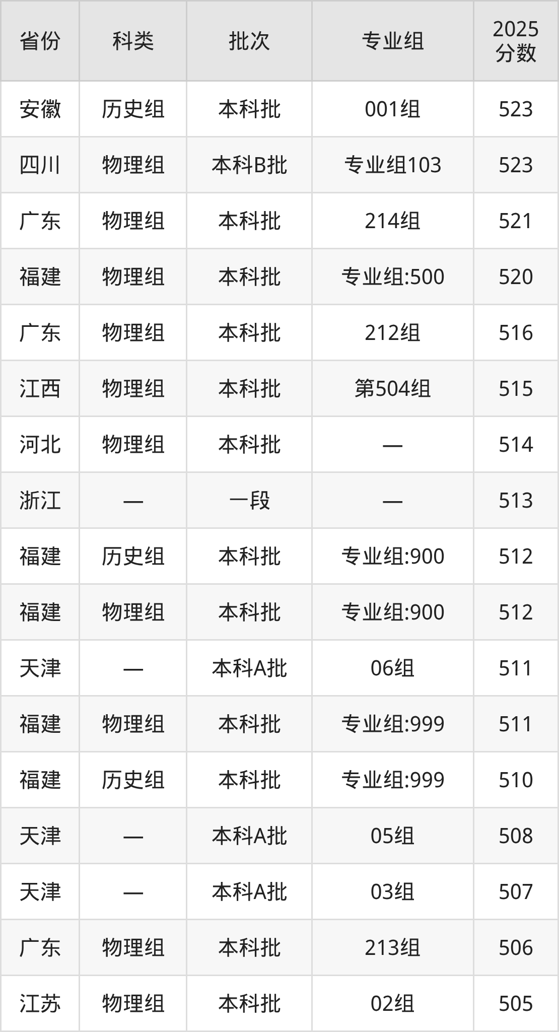 2025年泉州师范学院在全国普通批次招生的录取分数范围位于413~596分之间,其中省内分数范围为510分~520分,物理组最低分专业组为“专业组:999”,考生511分即可报考,历史组最低分专业组为“专业组:999”,考生510分即可报考。