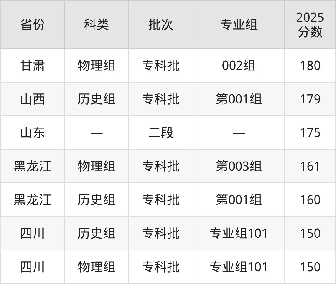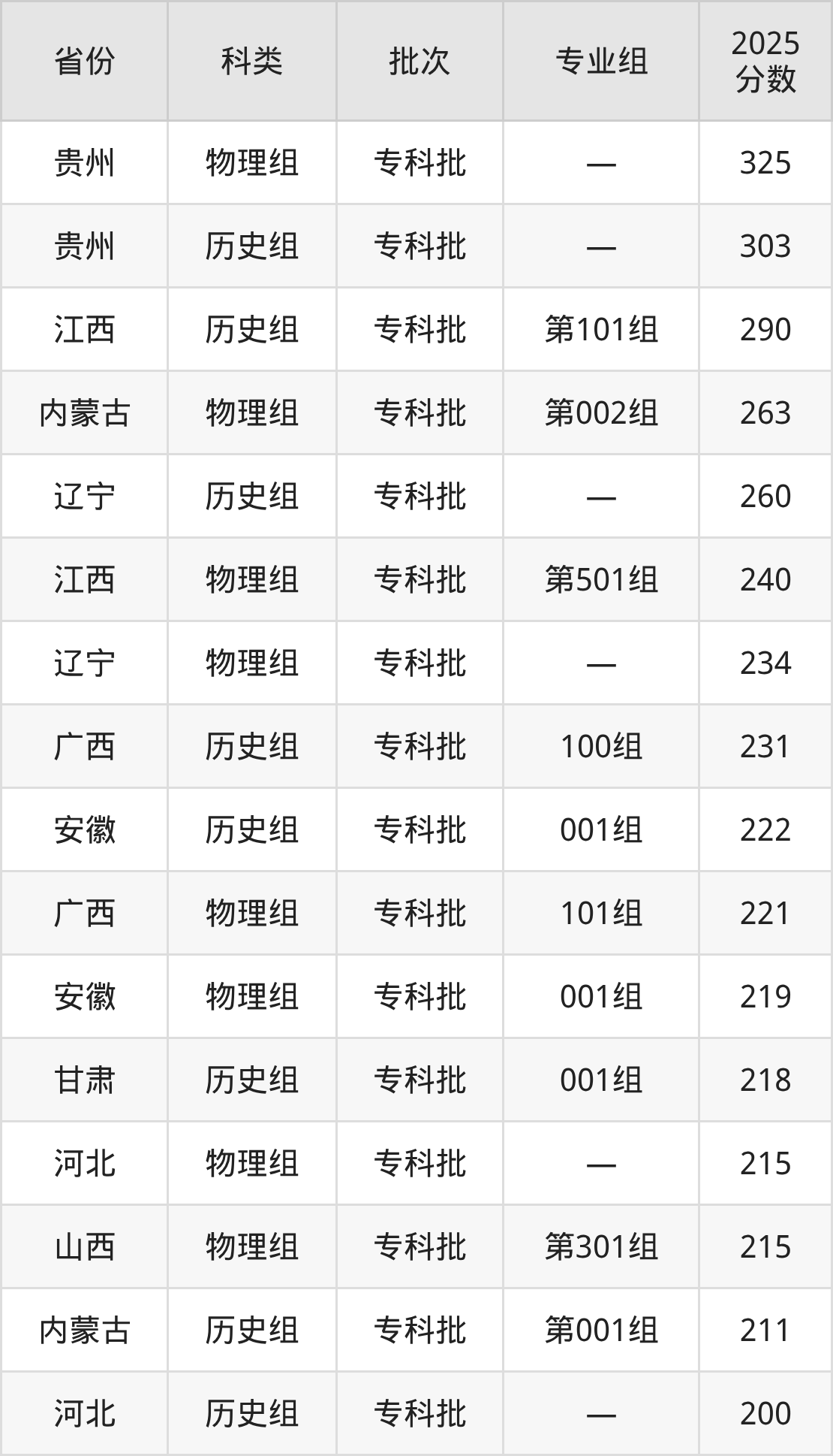 而贵州地区物理组考生的分数门槛最高,2025年哈尔滨应用职业技术学院在贵州招生最低分为325分,考生至少要超专科线145分才有可能被录取。