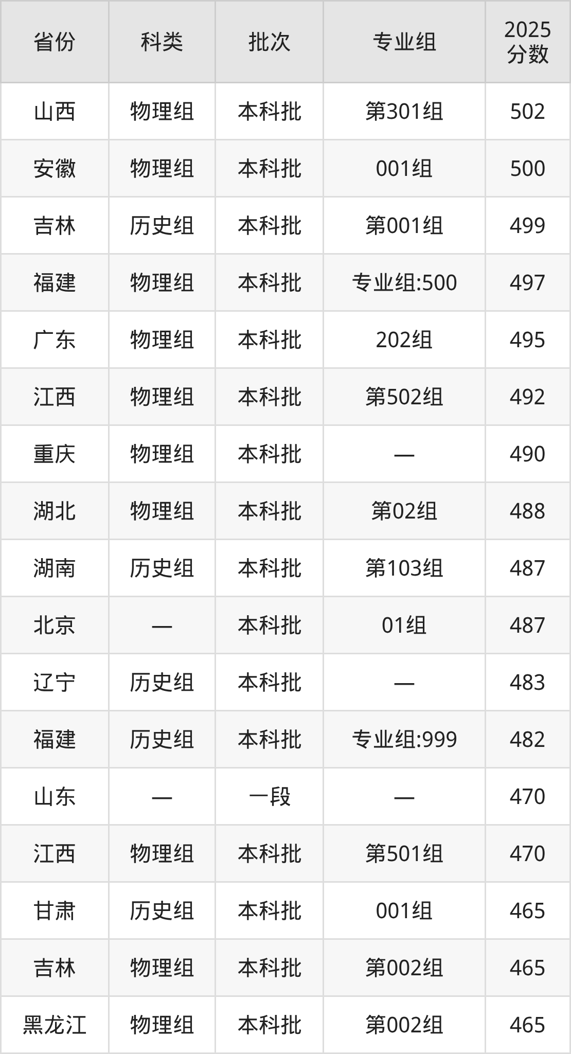 下面是宝鸡文理学院2025年在全国各省的录取分数线一览表,供参考: