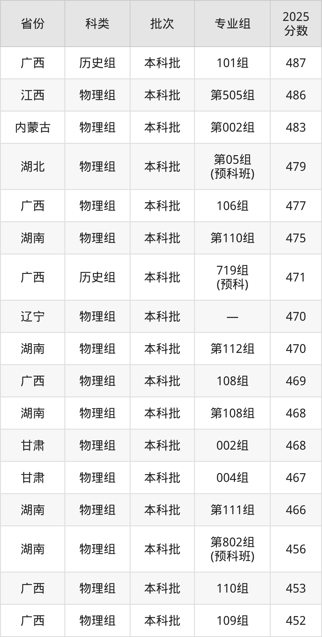 丽水学院在省外招生的最低分为439分,其中广西地区物理组考生上丽水学院的分数门槛最低,考生成绩超本科线69分(439分)可上。其次是甘肃物理组考生,上丽水学院至少要超本科线73分(447分)。
