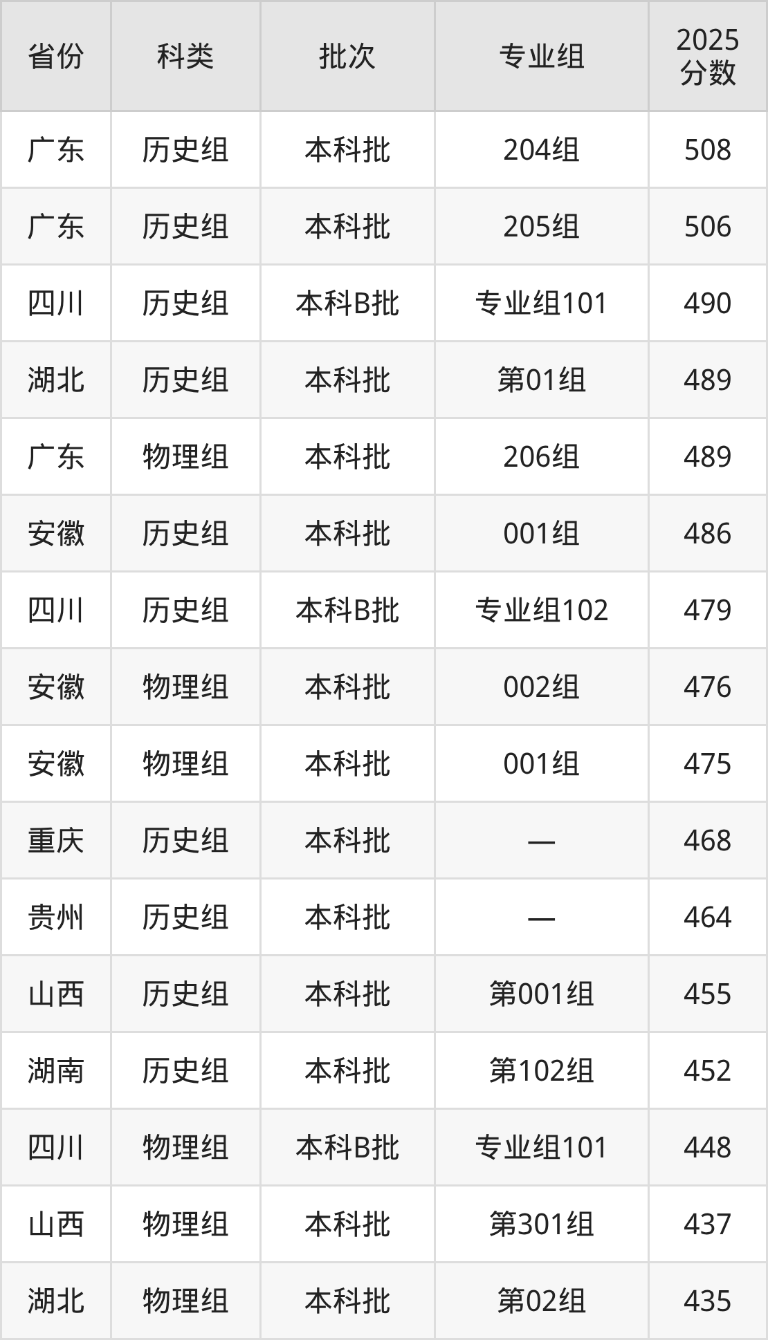 而广东地区历史组考生的分数门槛最高,2025年湖南应用技术学院204组在广东招生最低分为508分,考生至少要超本科线44分才有可能被录取。
