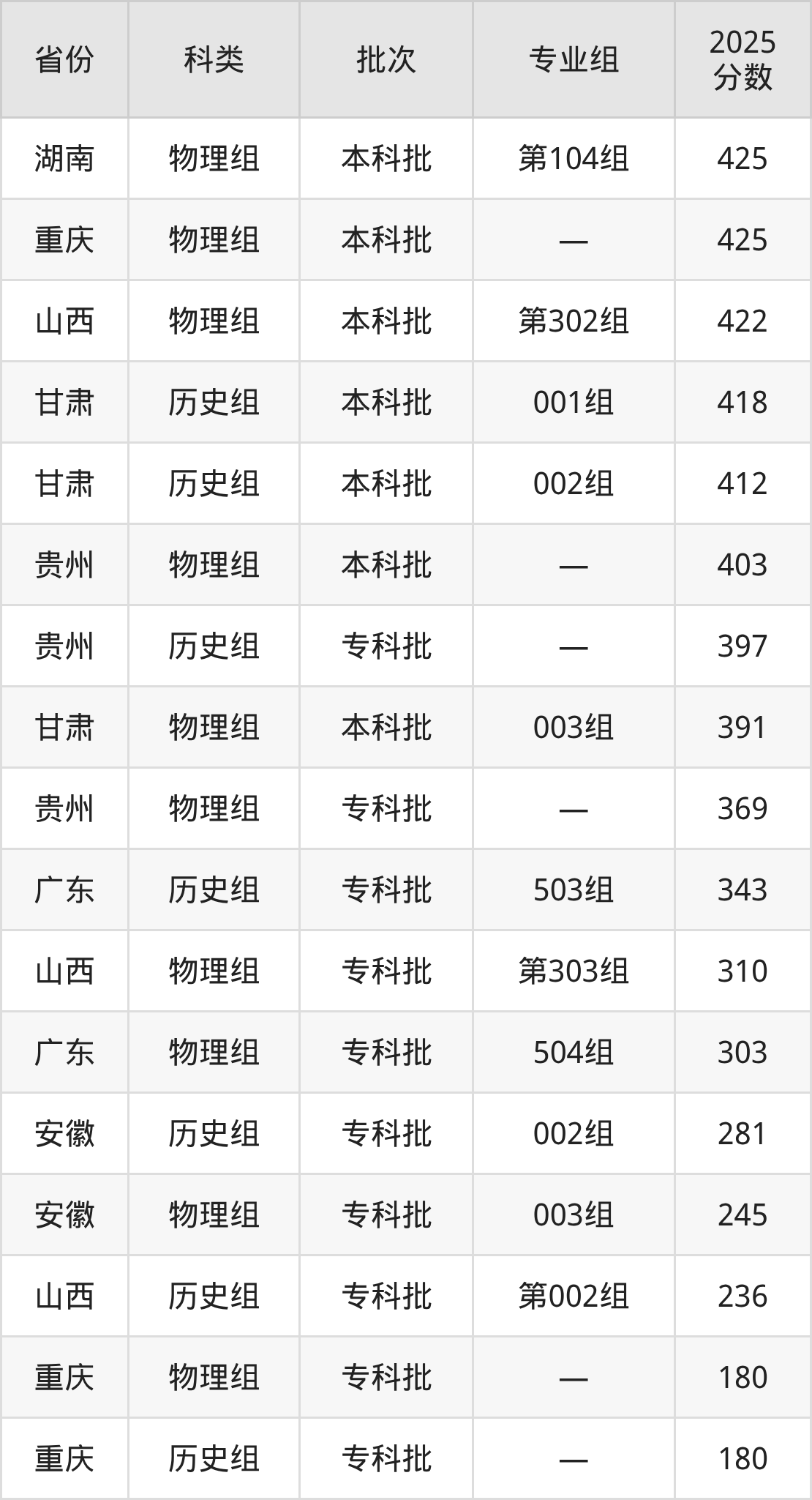 2025年湖南应用技术学院在全国普通批次招生的录取分数范围位于150~508分之间,其中省内分数范围为425分~452分,历史组最低分专业组为“第102组”,考生452分即可报考,物理组最低分专业组为“第104组”,考生425分即可报考。